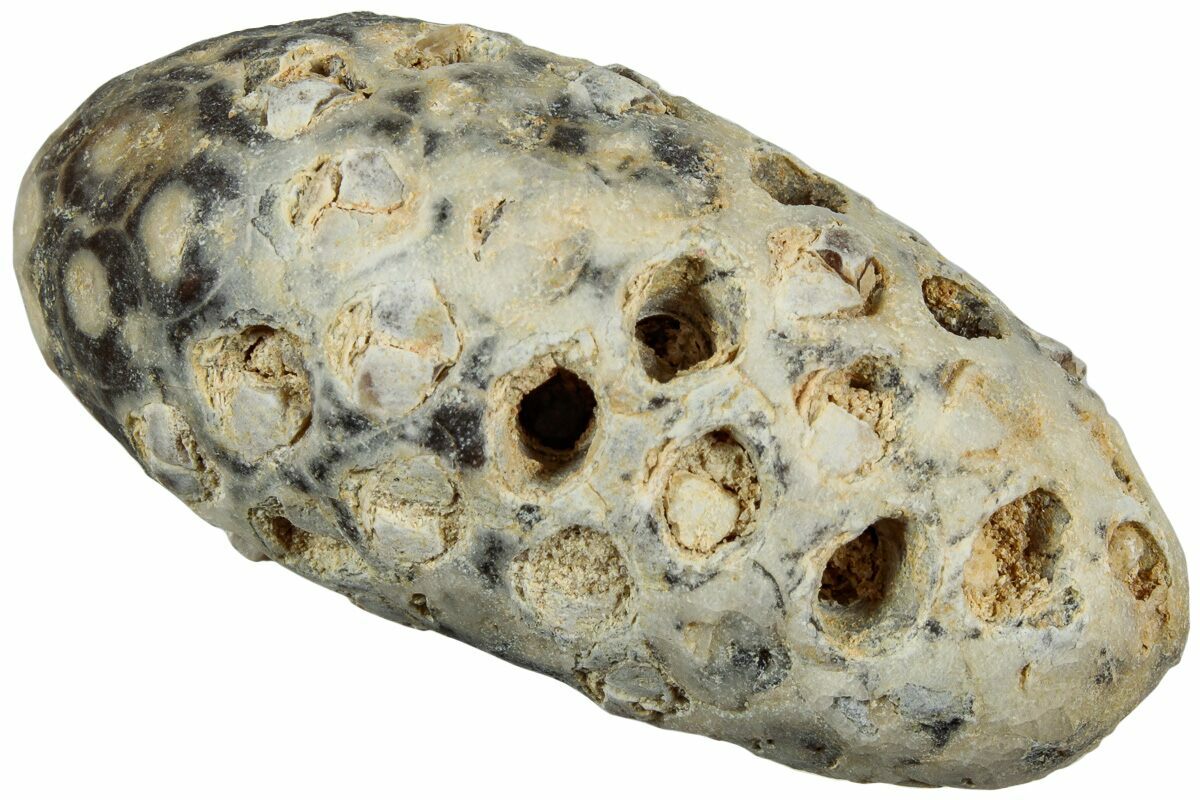 These seed cones found in the Western Sahara of Morocco have are a bit of a mystery and have not yet been described. They are often labeled is "pine cones" and there has also been speculation that they might be aggregate fruits or horsetail seed pods. But, most likely these silica-replaced (agatized) fossils are the seed pods of Cycadophytes. These fossil cones often bear the signs of insect predation, being partially eaten.