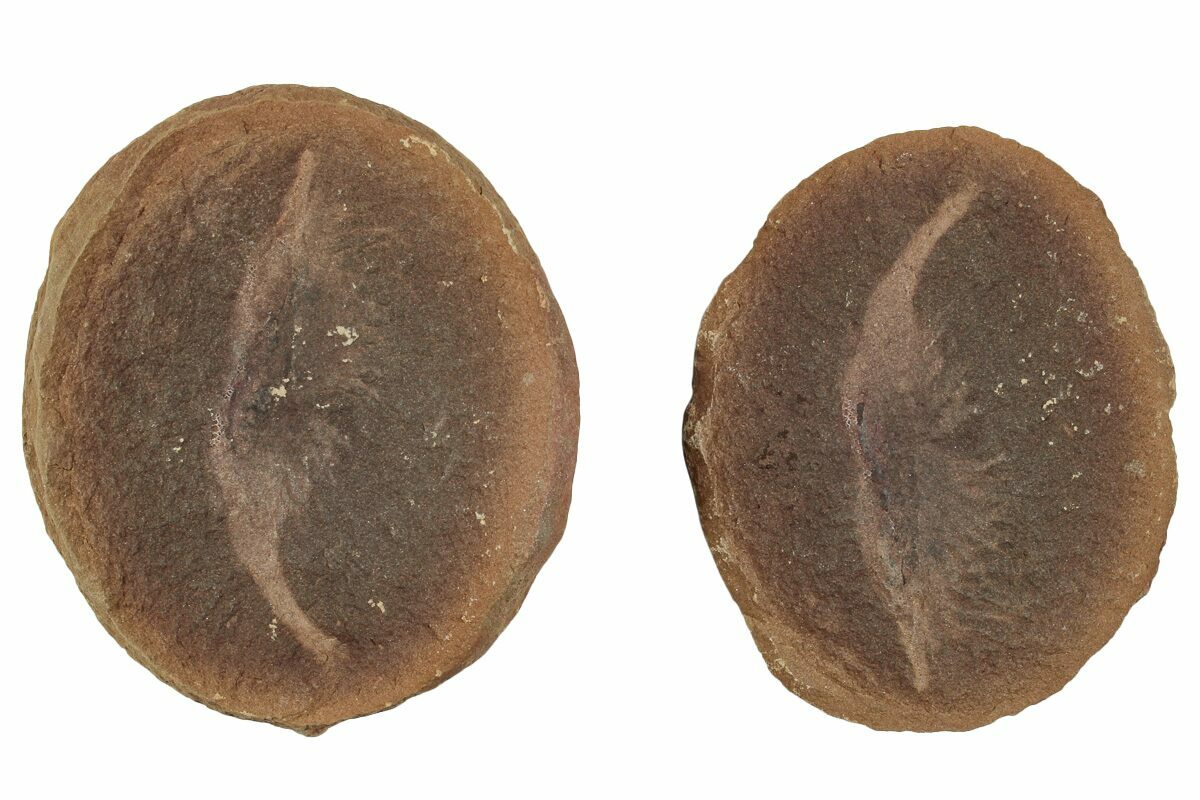 This is a 1.6" fossil shrimp (Peachocaris strongi), preserved in an ironstone nodule from the Carbondale Formation near Astoria, Illinois. This specimen includes the positive (convex) and the negative (concave) sides of the fossil, each of which is accompanied by an acrylic display stand.