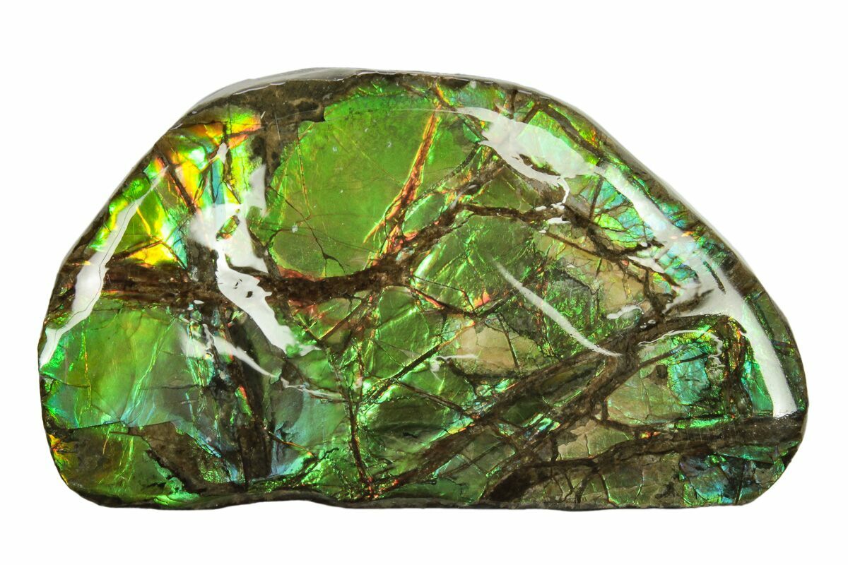 Ammolite is an opal-like gemstone found primarily in Alberta, Canada. It is a kind of fossilized shell from ammonites, which in turn are composed primarily of aragonite, the same mineral contained in nacre (mother-of-pearl). The shell's microstructures are often preserved. In 1981, ammolite was given official gemstone status by the World Jewellery Confederation (CIBJO).