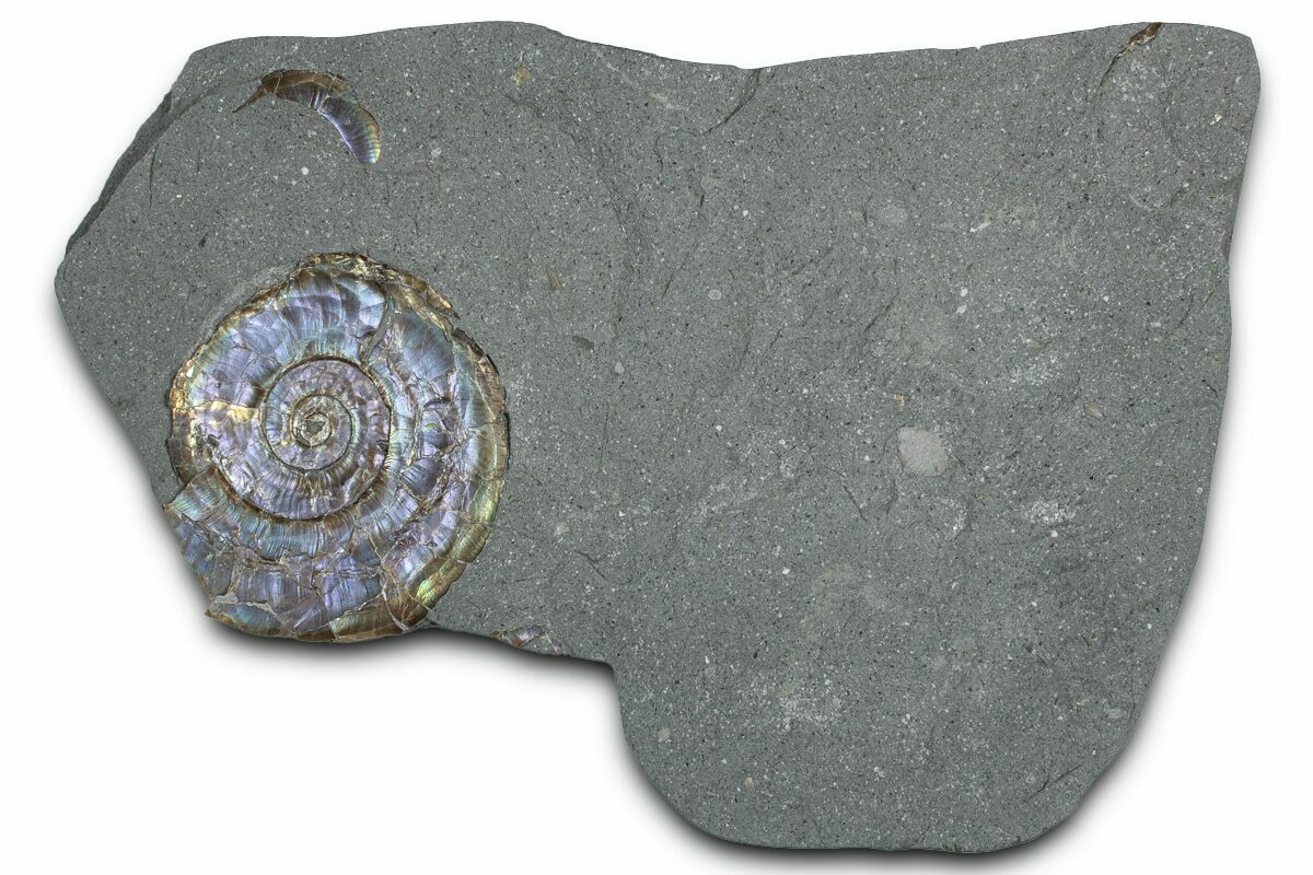 This plate of rock contains a brilliantly iridescent ammonite (Psiloceras planorbis, 1.6" wide) from England. Its naturally iridescent shell displays some beautiful blues, greens, and oranges. Like most fossils from the Blue Lias Formation, these ammonites have been compressed and flattened by the same geological processes of heating and pressure, forming this iridescence.