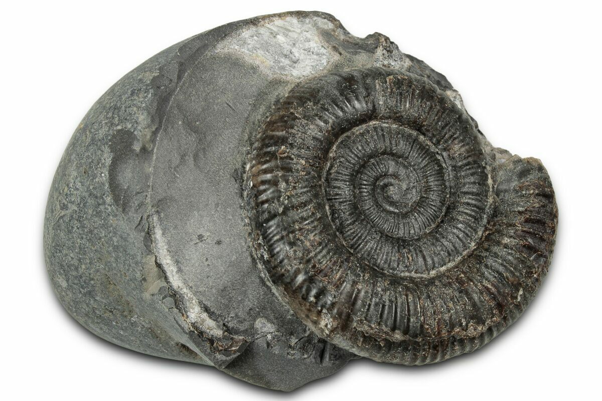 This is a classic British ammonite of the species Dactylioceras commune. These well preserved ammonites are Jurassic in age and are found in hard concretions that must be split open to reveal the fossil. The hard rock then has to be removed mechanically to further expose the fossil.