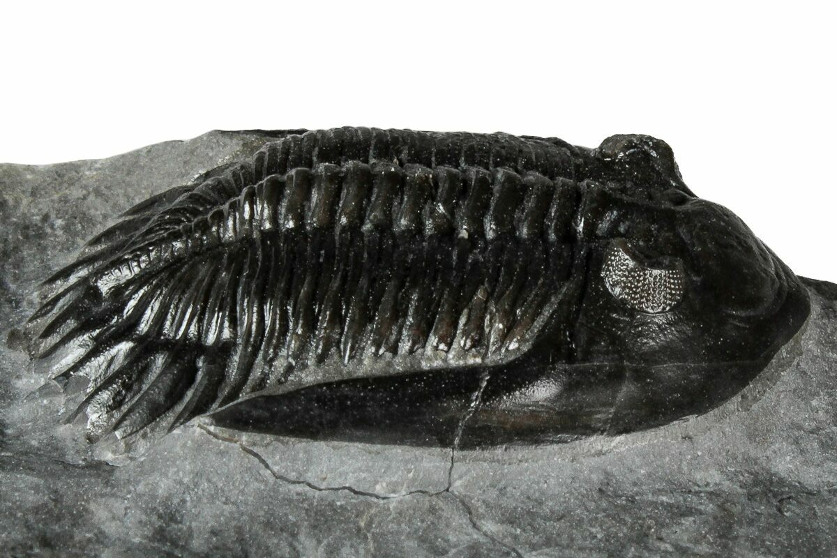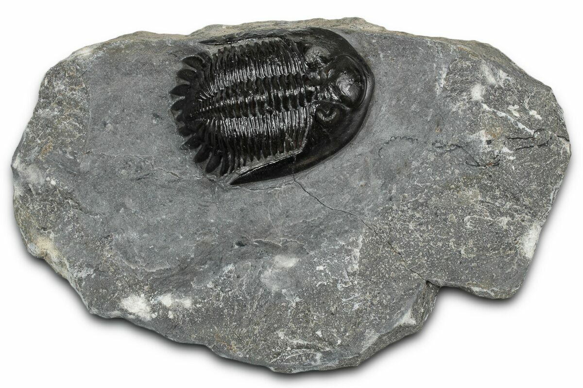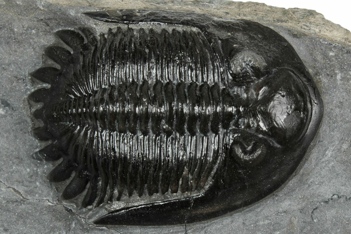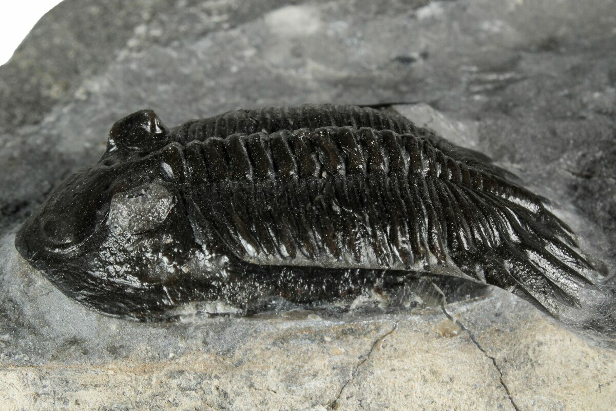 This is a gorgeous, 1.6" long specimen of the uncommon trilobite Mrakibina cattoi. This species is quarried near Mrakib, Morocco. It has a small spot of restoration on the left genal spine.