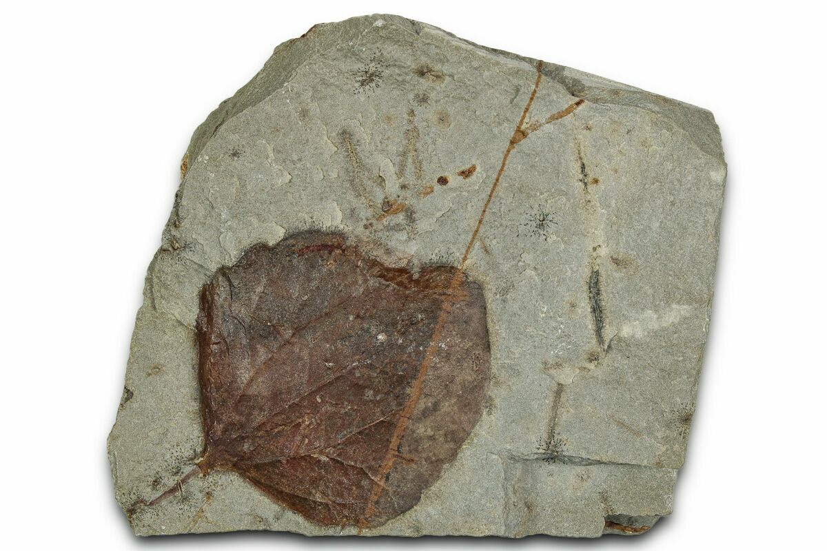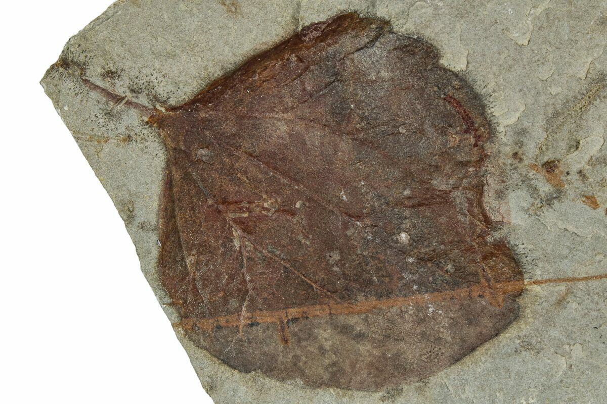 This is a 1.6" long (including stem) fossil leaf (Zizyphoides flabellum) from the Fort Union Formation near Glendive, Montana. The orange/brown preservation contrasts well against the shale, and many of the details in the leaf can be seen in good relief. There may be some touchups to the surface of the leaf where some of it flaked onto the negative during collection.