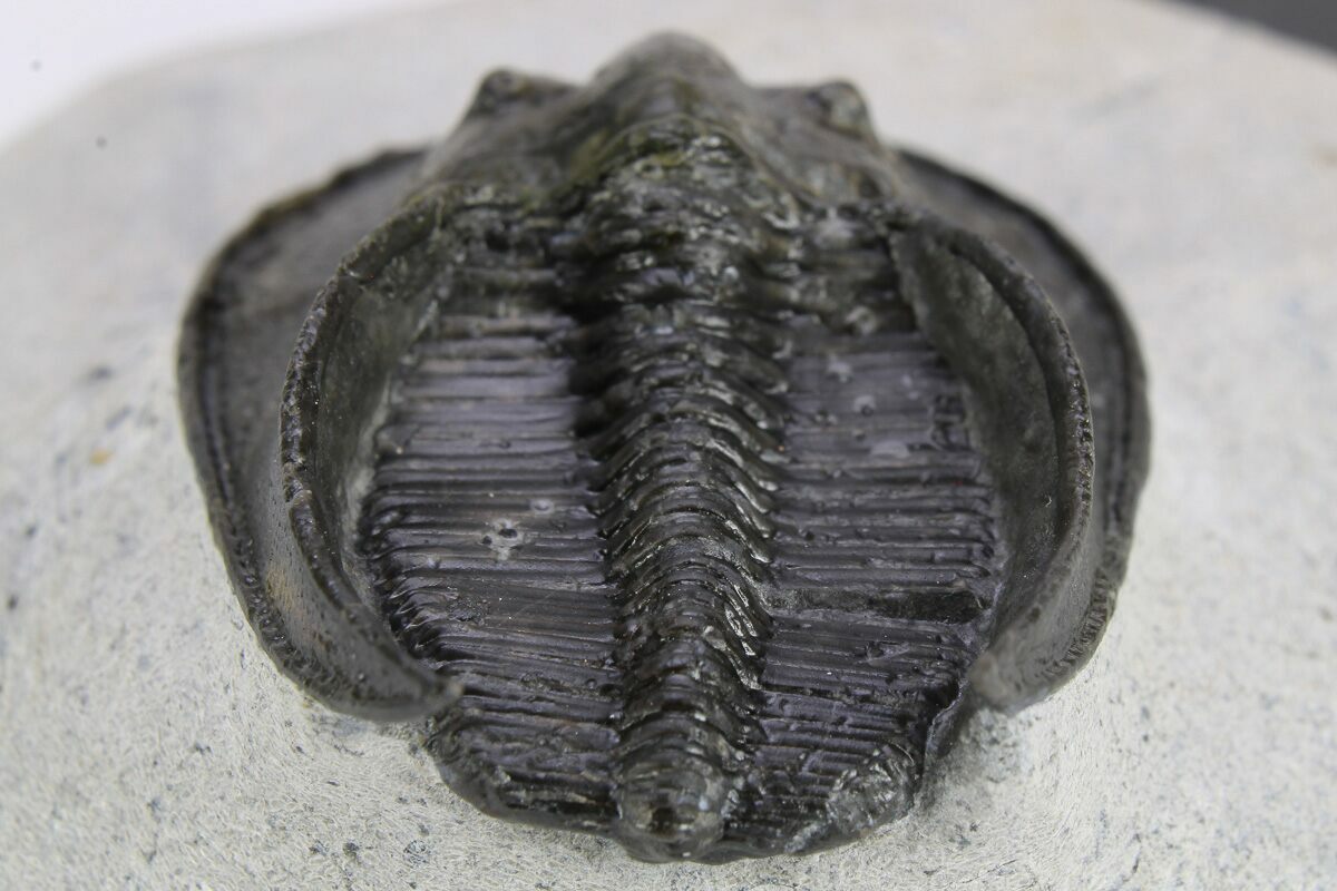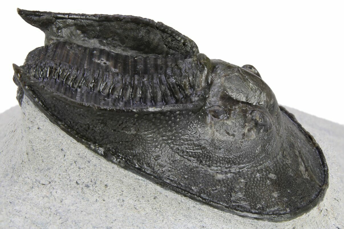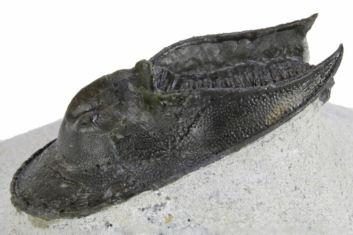 Here is an nice example of the Harpetida trilobite Scotoharpes sp. from Morocco. It has a very dramatic "head shield" which is often interpreted as a mechanism to help it stay on top of a soft ocean floor. This preglabellar ring (head shield) is covered in many sensory pits which may have held hairlike features when the trilobite was alive.