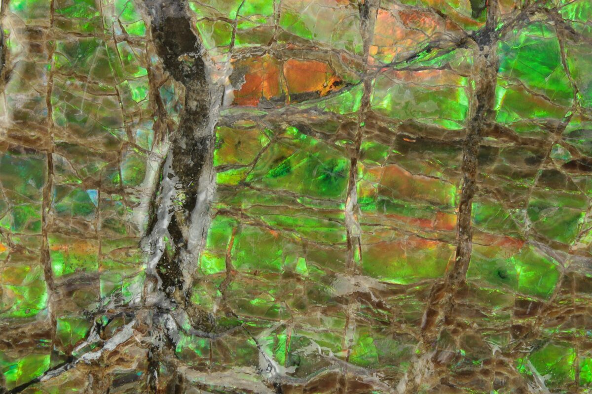 Ammolite is an opal-like gemstone found primarily in Alberta, Canada. It is a kind of fossilized shell from ammonites, which in turn are composed primarily of aragonite, the same mineral contained in nacre (mother-of-pearl). The shell's microstructures are often preserved. In 1981, ammolite was given official gemstone status by the World Jewellery Confederation (CIBJO).