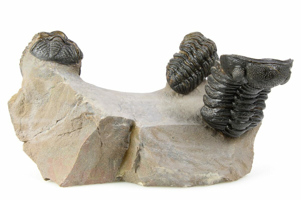 This a beautiful, 1.6" long Erbenochile erbeni trilobite naturally associated with three Morocops. The preparation on the piece is fantastic with less than 1% shell restoration in total. The larger Morocops has been prepared so that the hypostome on its underside can be seen.