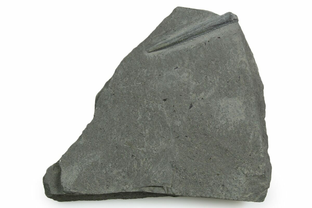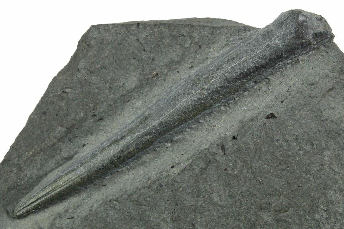 This is a 1.65" long fossil belemnite (Youngibelus cf. gigas) rostrum from the Jurassic age Posidonia Shale of Holzmaden, Germany. The belemnite has been exposed from the rock it was found in.