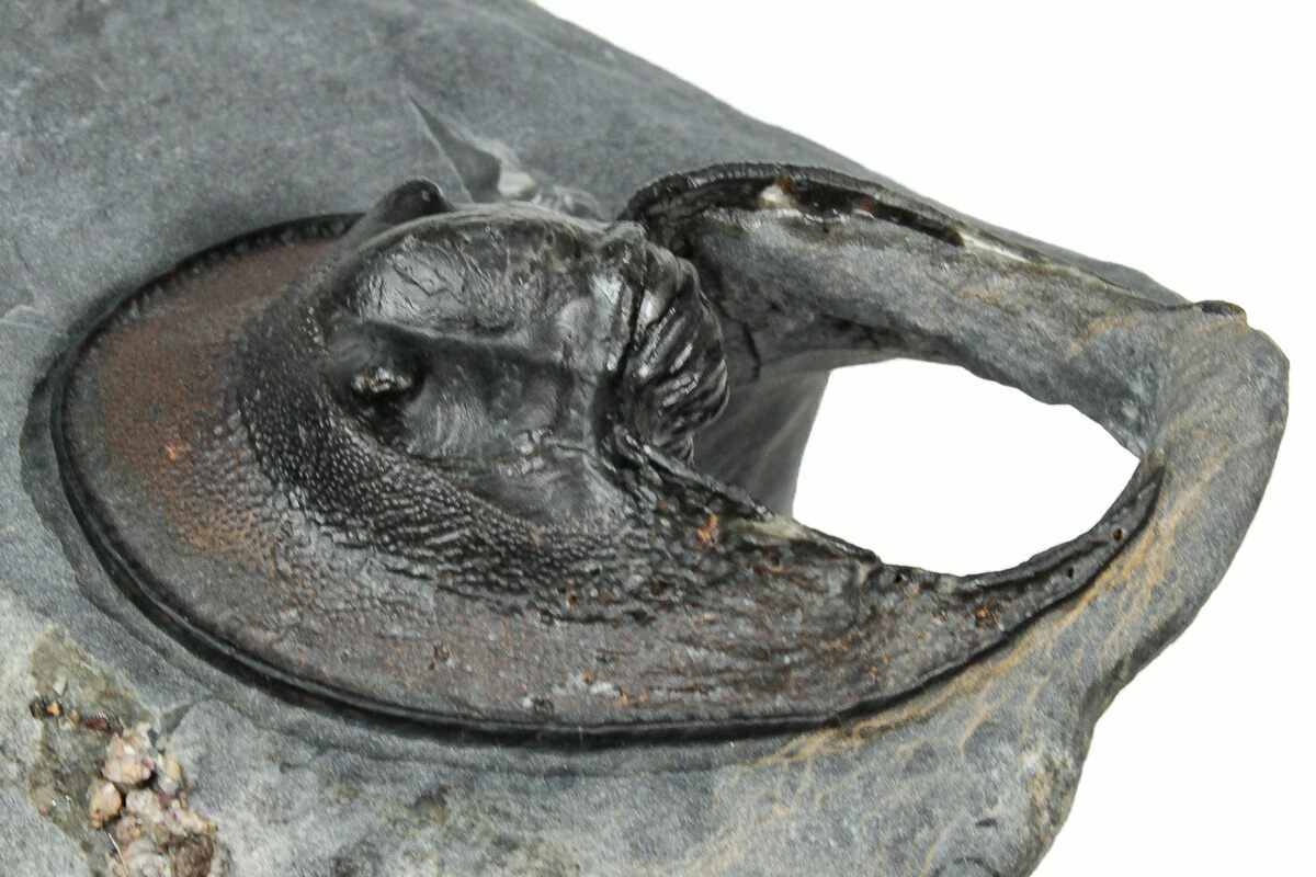 This specimen is beautiful with a red-brown head shield and nice preparation. Total restoration is about 4% mainly along the right edge of the head shield.