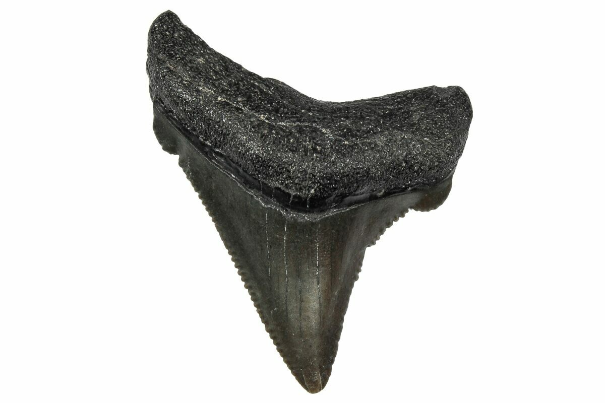 This is a serrated, 1.650" long fossil Otodus angustidens shark tooth. Angustidens is believed to be an ancestor of the fearsome megalodon shark, though it did not grow nearly as large.