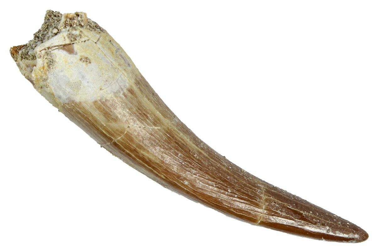 This is a 1.66" tooth from the Cretaceous marine reptile Zarafasaura oceanis, a long-necked plesiosaur known from the phosphate-rich Oulad Abdoun Basin of Morocco. The enamel displays nice preservation and natural coloration.