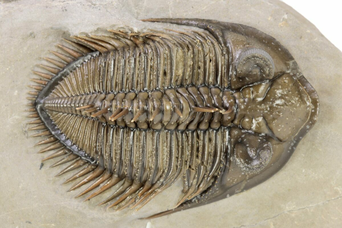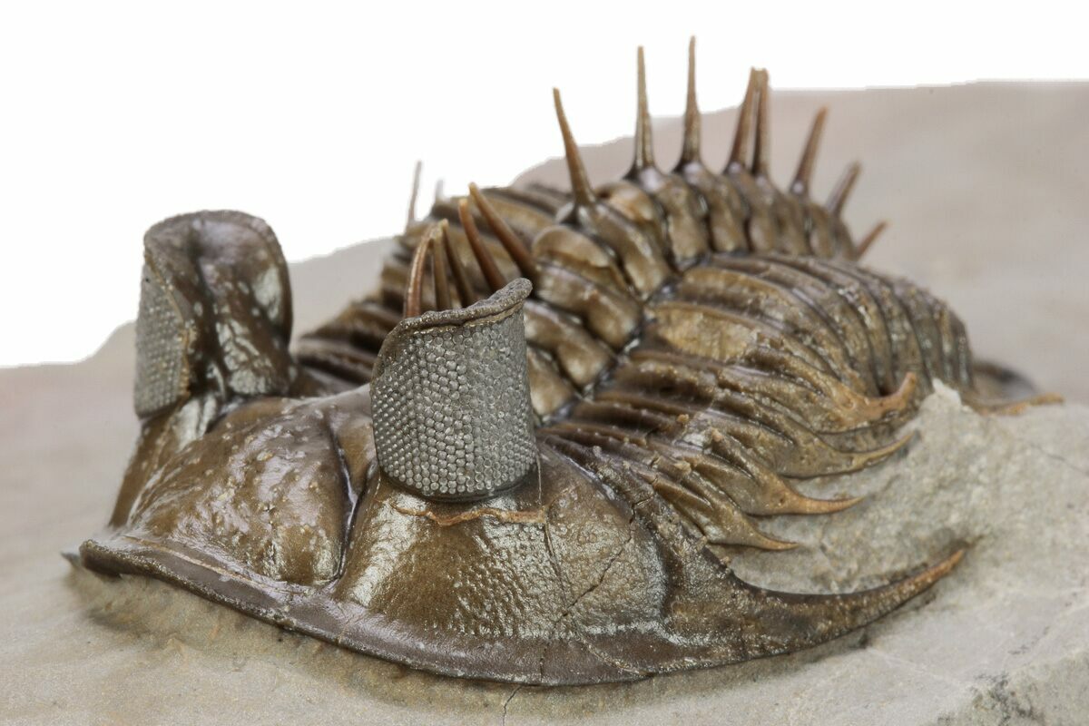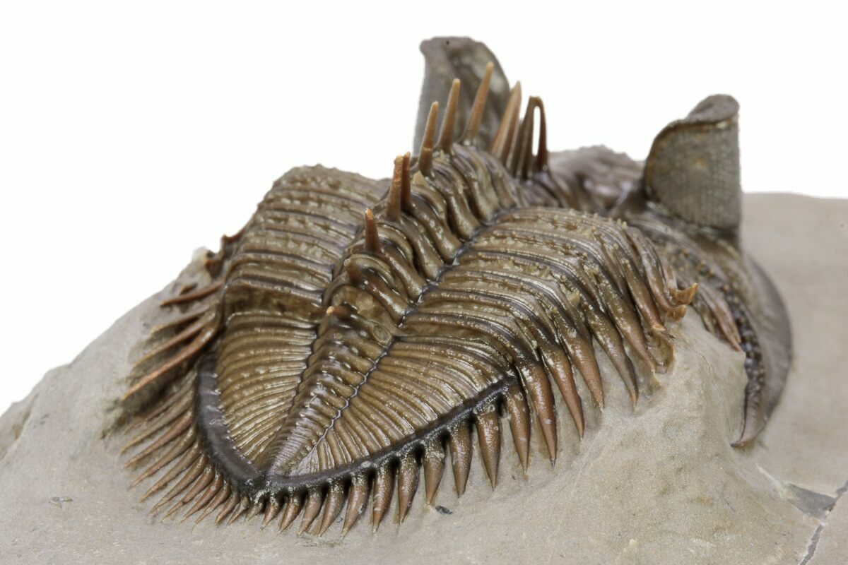 This an amazing, 1.7" long, tower-eye, Erbenochile erbeni trilobite from Foum Zguid, Morocco. Excellent preparation with dozens of free-standing spines and clear eye facets. The preparation on this example is exceptional. It has about 2% shell restoration on a couple of the segments.