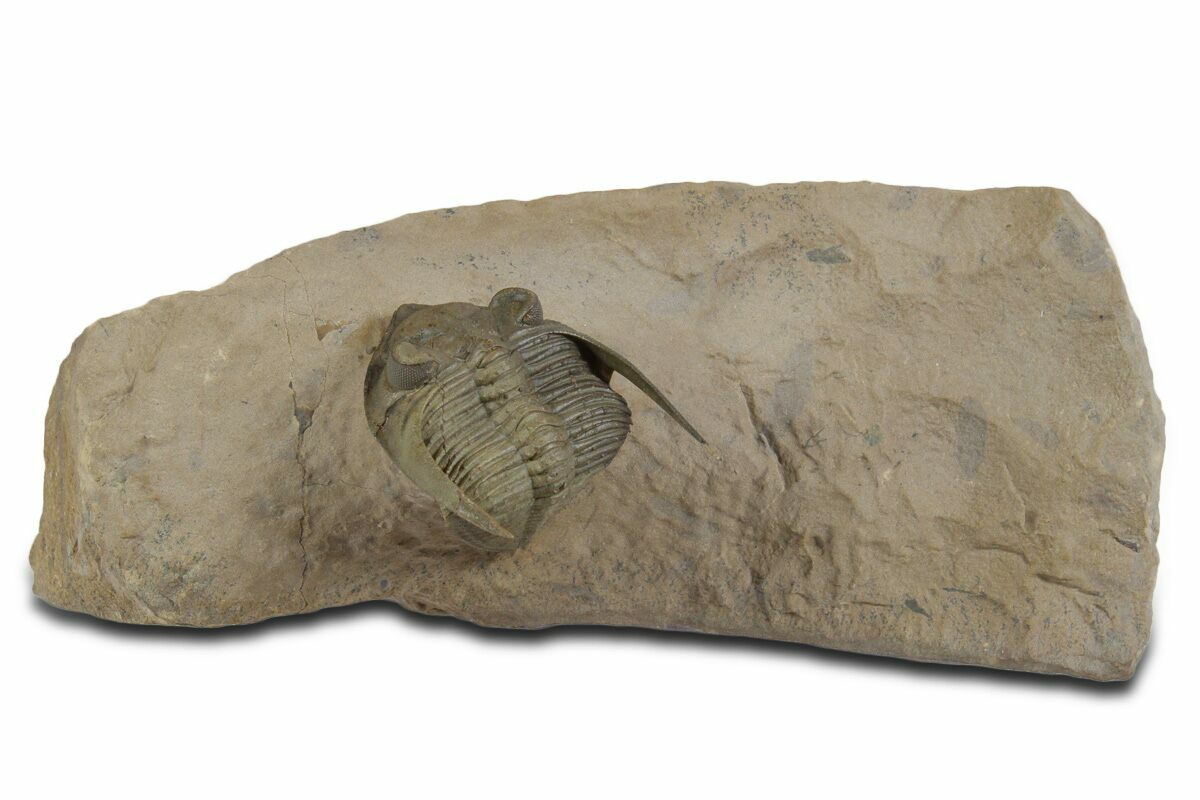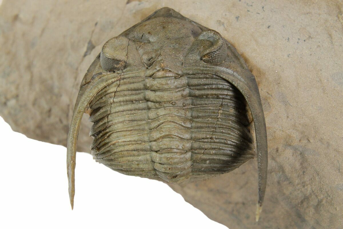 This is a detailed, 1.7" long specimen of Zlichovaspis spinifera collected near Lghaft, Morocco.. There is preserved eye facets in both eyes with free-standing genal spines. There are tiny spines preserved all over its thorax. It has no restoration.