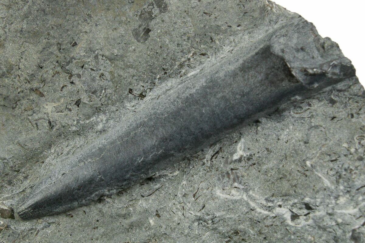 This is a 1.7" long fossil belemnite (Acrocoelites sp. indet.) rostrum from the Jurassic age Posidonia Shale of Holzmaden, Germany. The belemnite has been exposed from the rock it was found in.
