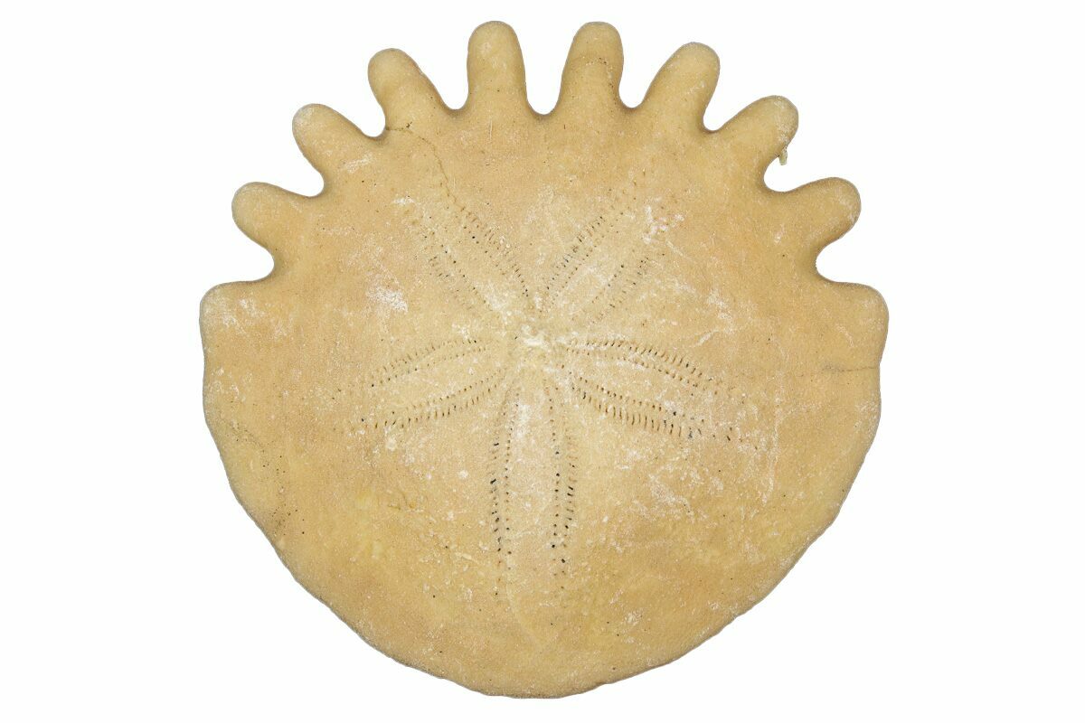 A sand dollar is a highly flattened form of urchin of the order Clypeasteroida. As an echinoderm, they have a pentameral (five-fold) symmetry to their body organization, a water vascular system, and an endoskeleton made of calcite plates. They live in shallow marine environments just below the low tide line, buried in the sand or mud. They range up to about 4 inches (10cm) in diameter. Most are about a third (7mm) to half (12mm) an inch thick, but some are over an inch thick. They are basically circular in shape, though some have flattened or indented sides. While alive, they are covered with velvety-looking spines that they use to move, much like other echinoderms. The most diagnostic indicator of fossil sand dollars is the five ovate form on the top side of the skeleton. These are part of the respiratory system and leave an easily identified “flower” on the skeleton. They are active predators, feeding on crustacean larvae, small copepods, diatoms, and algae.