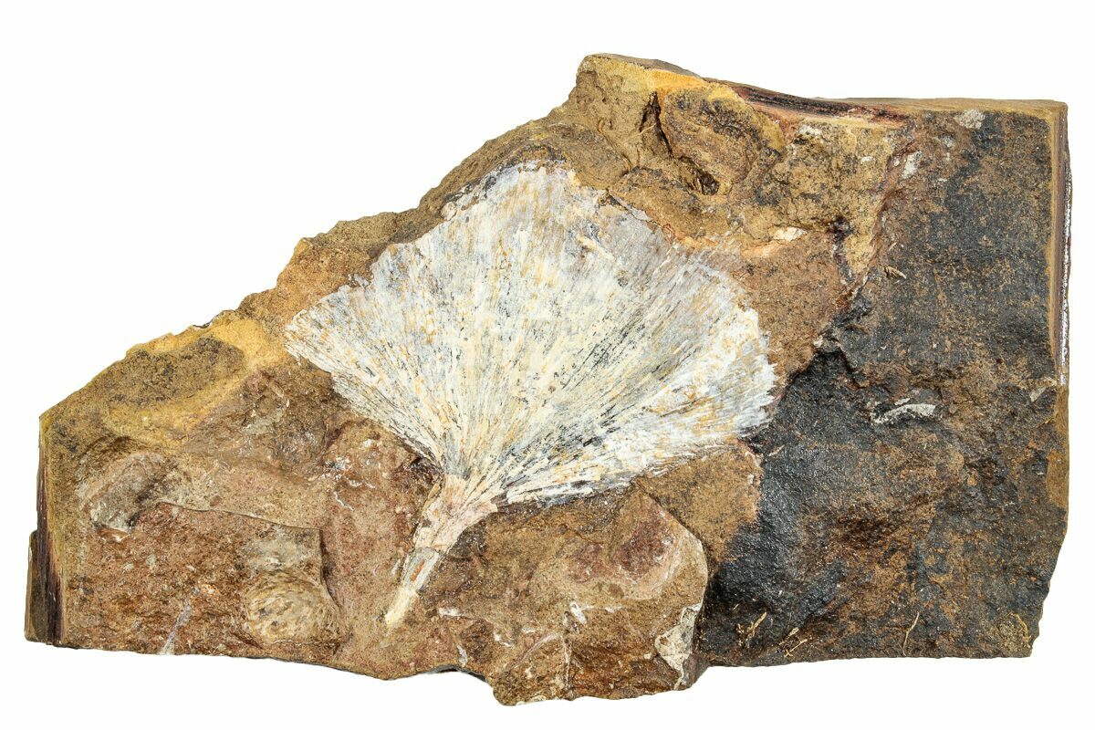 This is a beautiful 1.7" fossil Ginkgo (Ginkgo cranei) leaf from the Sentinel Butte Formation of North Dakota. It is finely detailed, and the light preservation contrasts well against the dark orangish-brown rock.