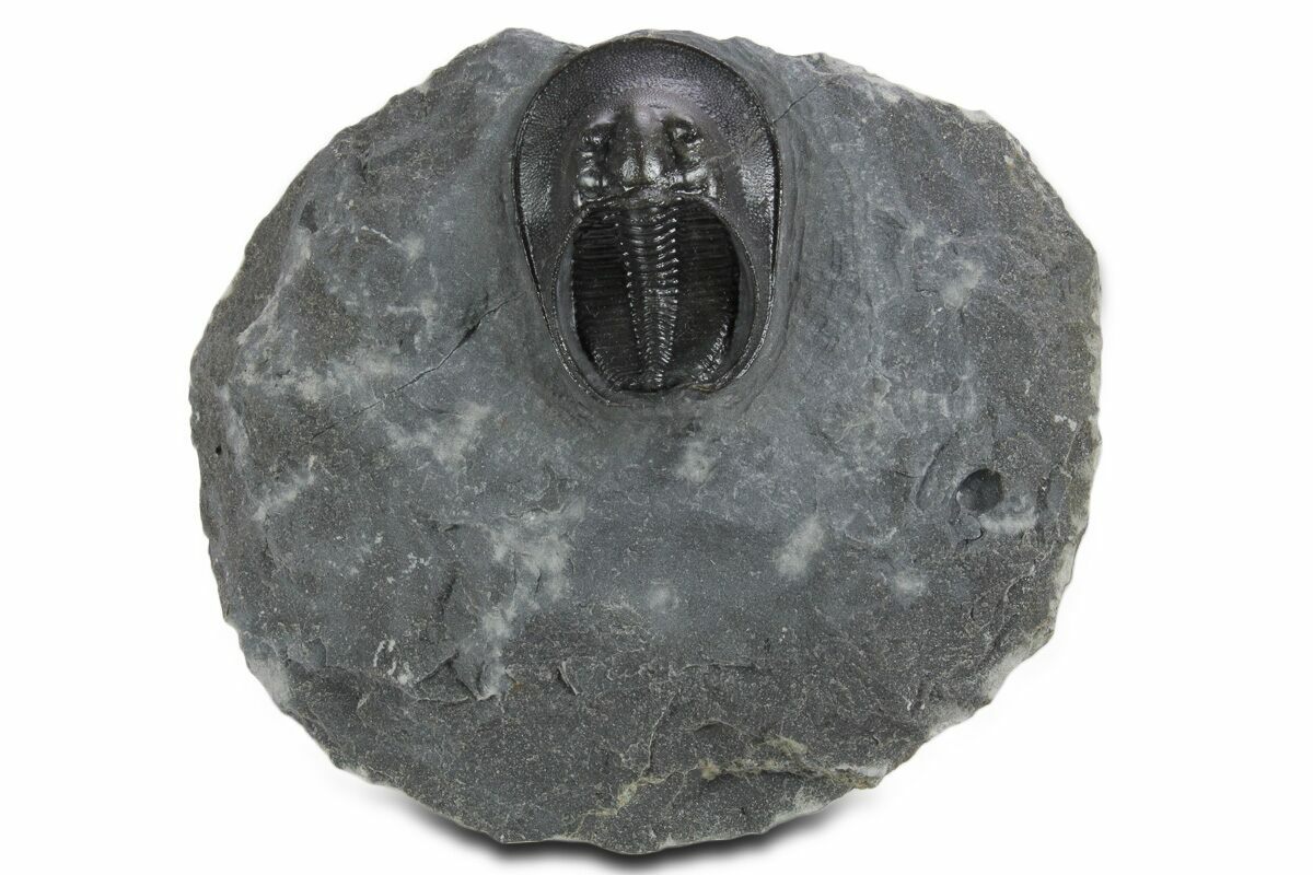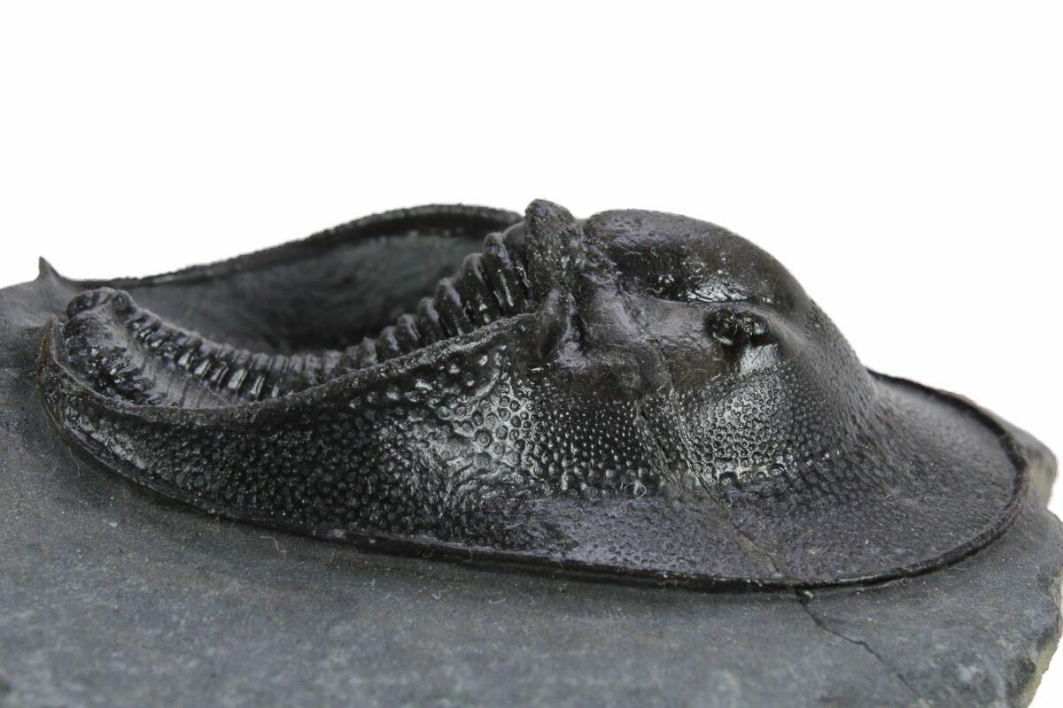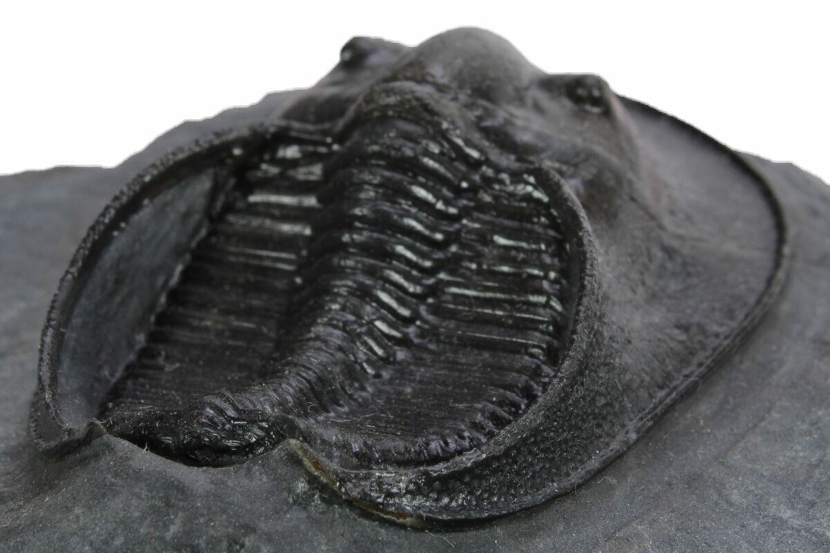 Here is a gorgeous, 1.7" long, prone example of the Harpetid trilobite Scotoharpes from Morocco. It has a very dramatic "head shield" which is often interpreted as a mechanism to help it stay on top of a soft ocean floor. This preglabellar ring (head shield) is covered in many sensory pits which may have held hairlike features when the trilobite was alive.