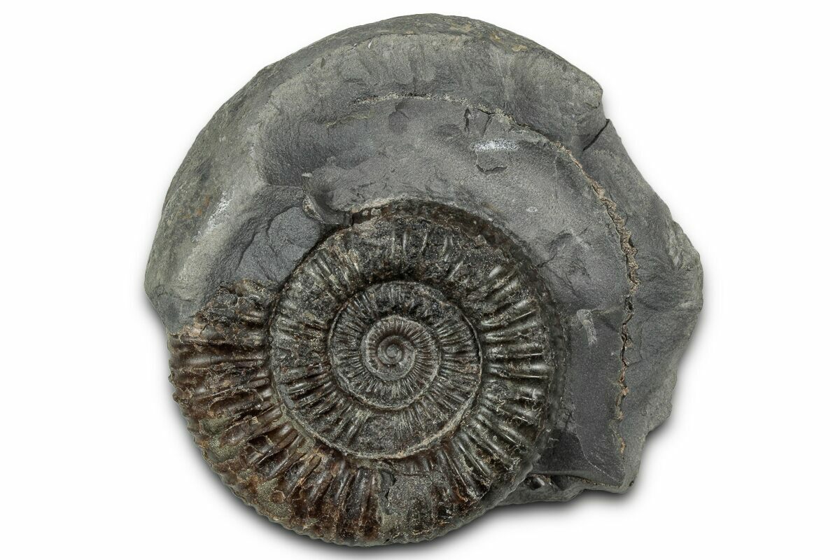 This is a classic British ammonite of the species Dactylioceras commune. These well preserved ammonites are Jurassic in age and are found in hard concretions that must be split open to reveal the fossil. The hard rock then has to be removed mechanically to further expose the fossil.