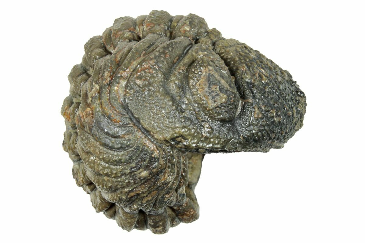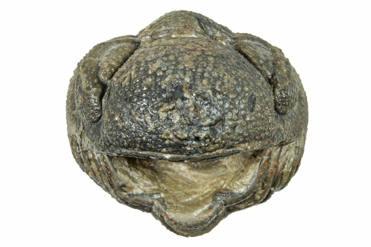 This is a enrolled, 1.7" long (if outstretched) Morocops trilobite from Morocco. It has a very bumpy shell and visible eye facet detail in both eyes.