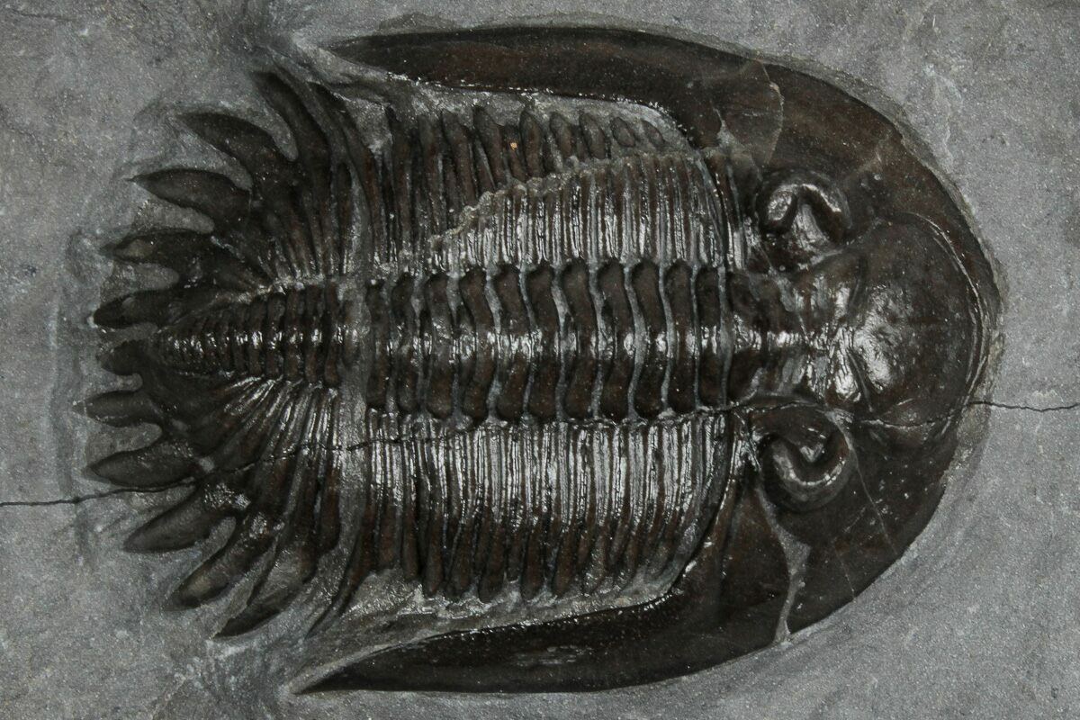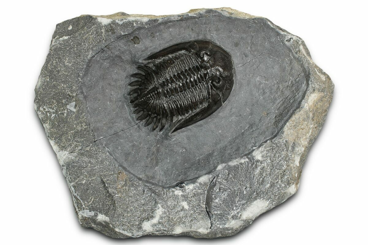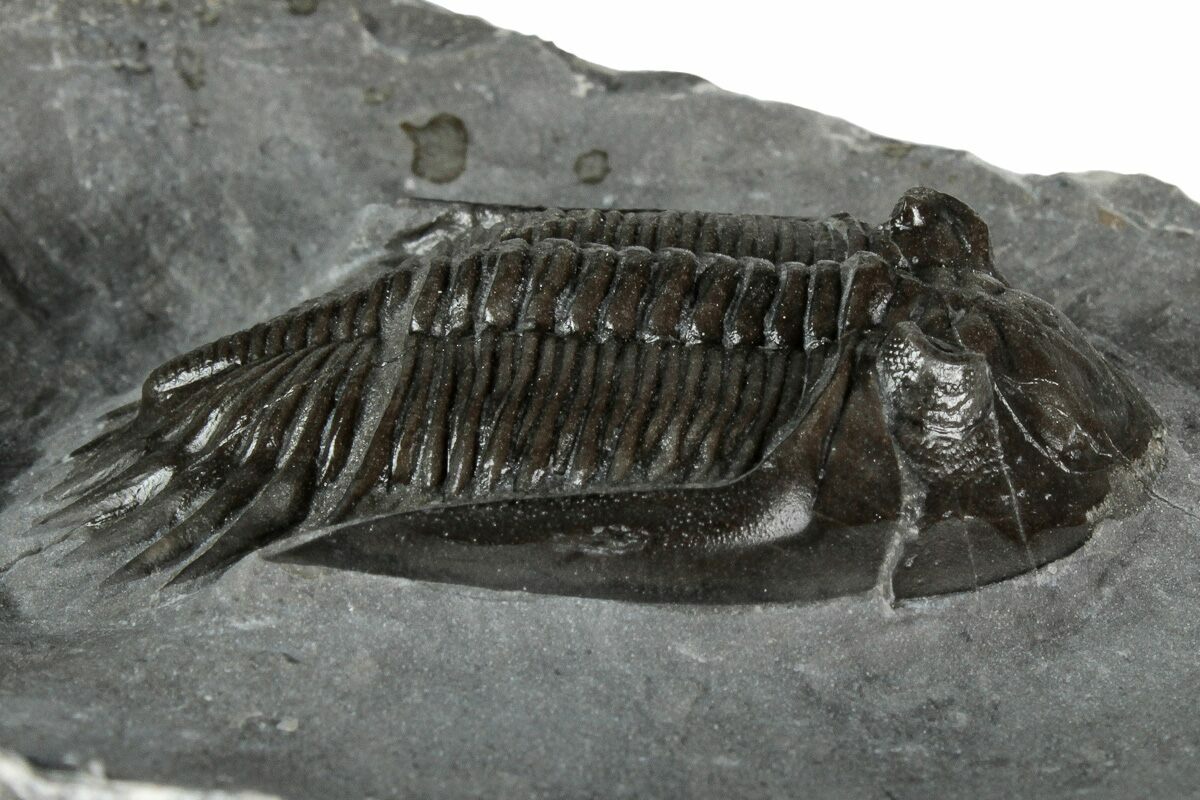 This is a gorgeous, 1.7" long specimen of the uncommon trilobite Mrakibina cattoi. This species is quarried near Mrakib, Morocco. It has no restoration.