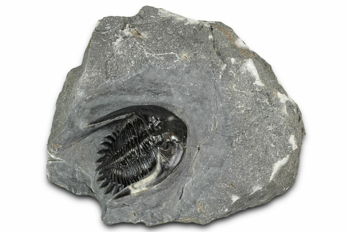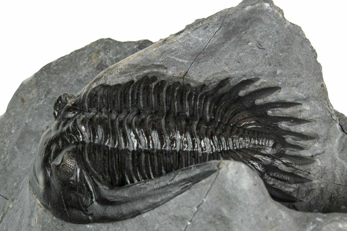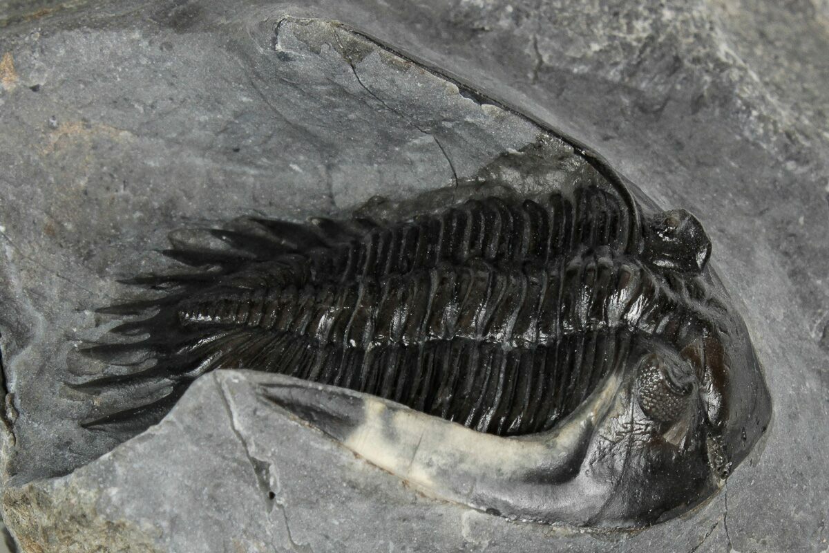 This is a gorgeous, 1.7" long specimen of the uncommon trilobite Mrakibina cattoi. This species is quarried near Mrakib, Morocco. It has no restoration.