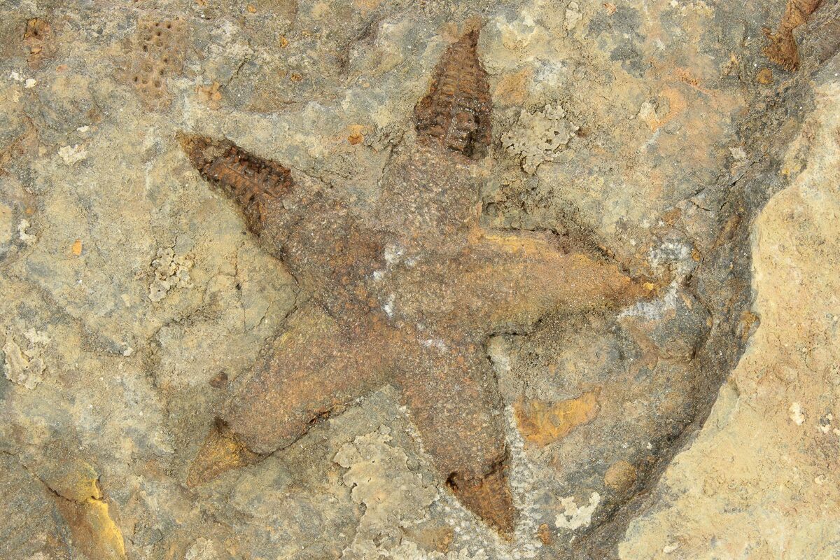 There is an Edrioasteroid likely of the genus Spinadiscus, and the pygidium of a trilobite, both of which are naturally associated with the starfish.