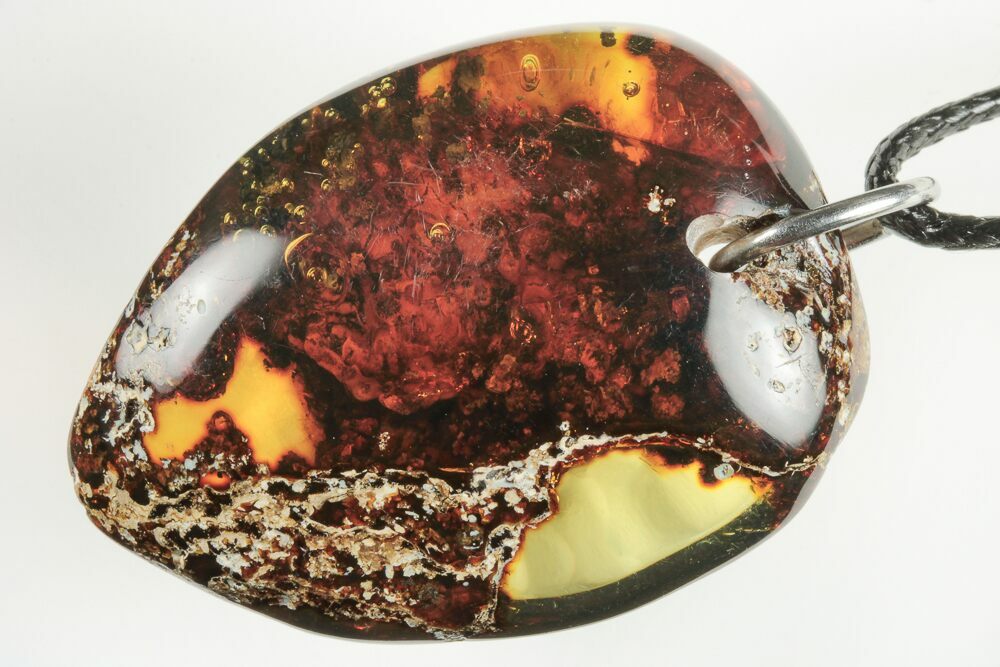 This is a 1.7" long, 11 gram piece of polished amber from Chiapas, Mexico. A hole has been drilled through one end of the amber which is accompanied by the pictured metal ring and string (approximately 22" long). Inclusions are unidentified plant material or fungus. Under UV light, the amber fluoresces a vibrant blue-green color and portions of this specimen exhibit green coloration just under natural light.