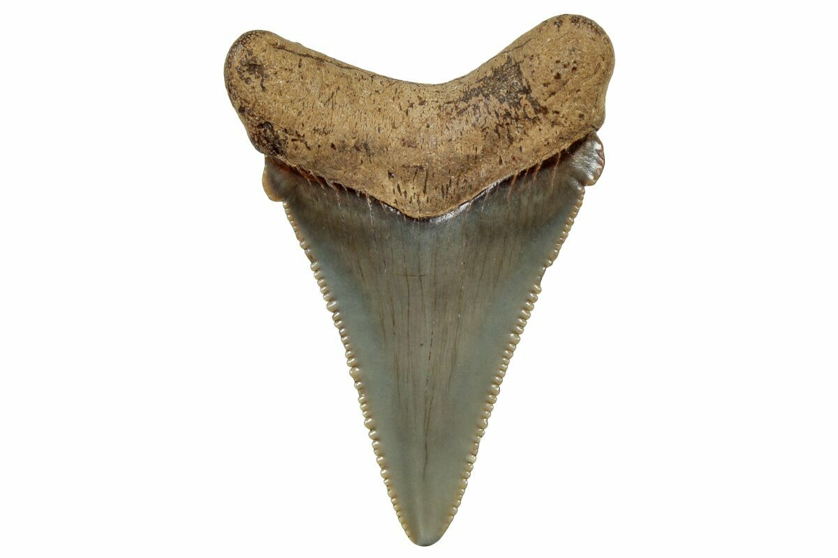 This is a serrated, 1.71" long fossil Otodus angustidens shark tooth. Angustidens is believed to be an ancestor of the fearsome megalodon shark, though it did not grow nearly as large. It has nice serrations and enamel.