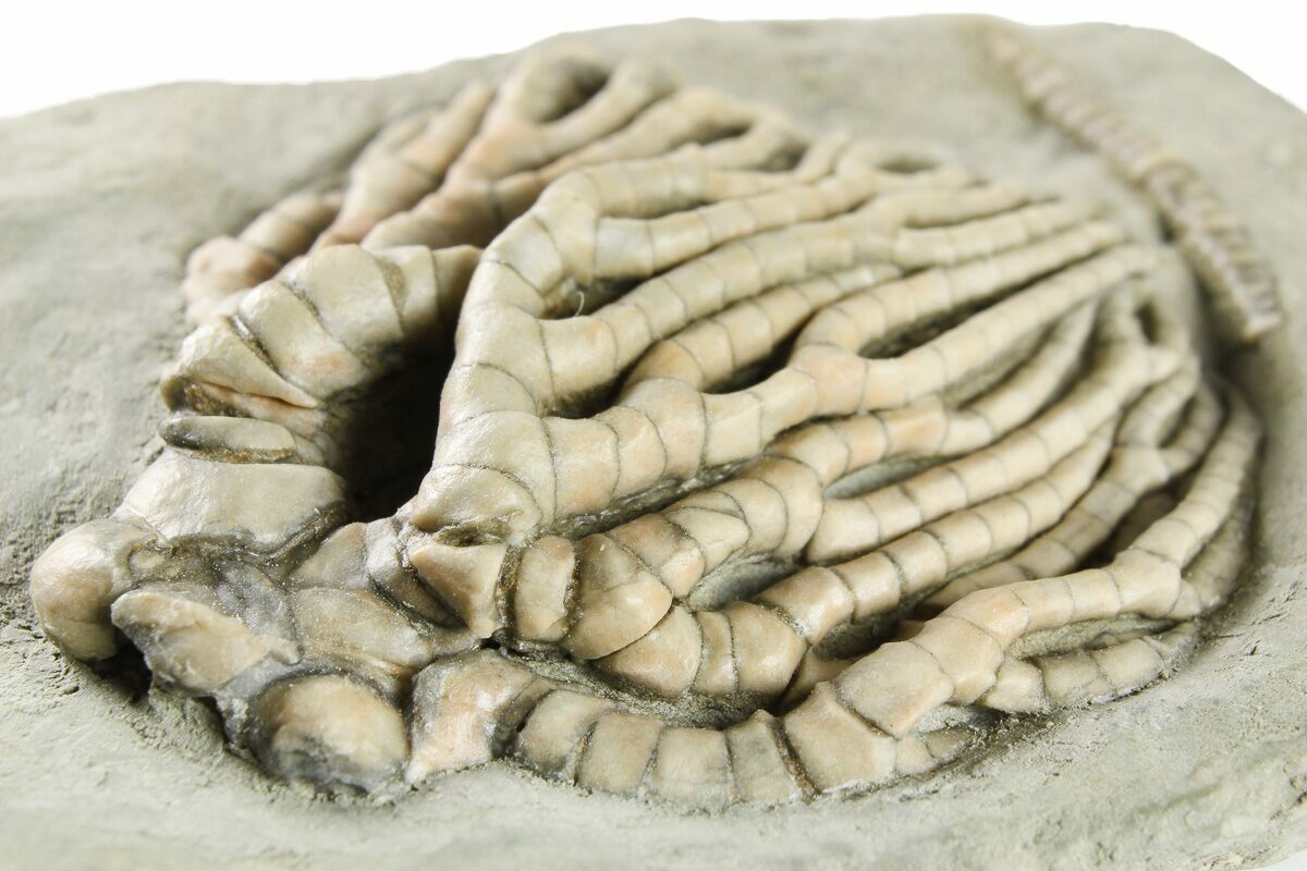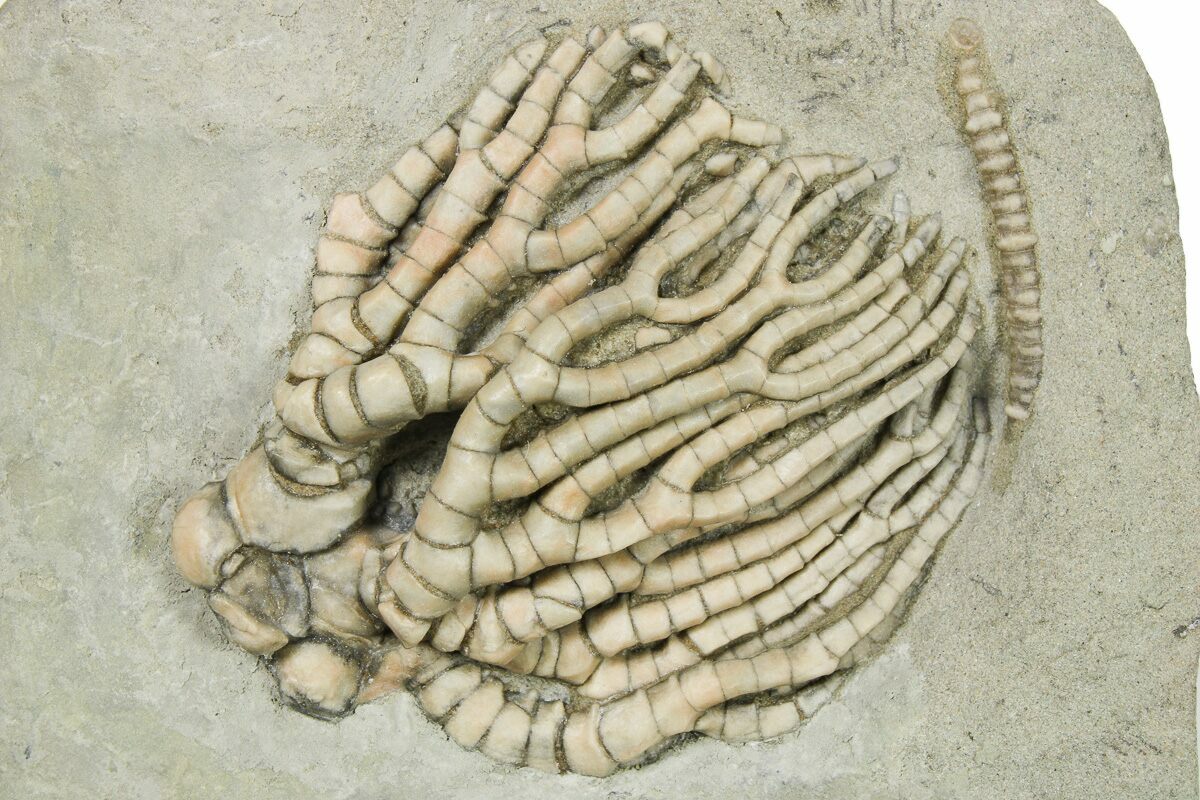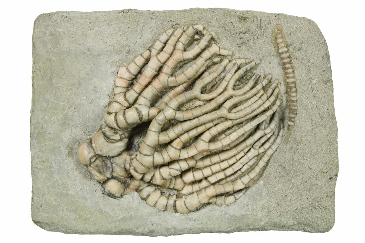 Crinoids from the Ramp Creek Limestone were likely buried in sediment from nearby deltas during storms. The resulting siltstone deposits are soft enough that fossils can be extracted in exquisite, three-dimensional relief.
