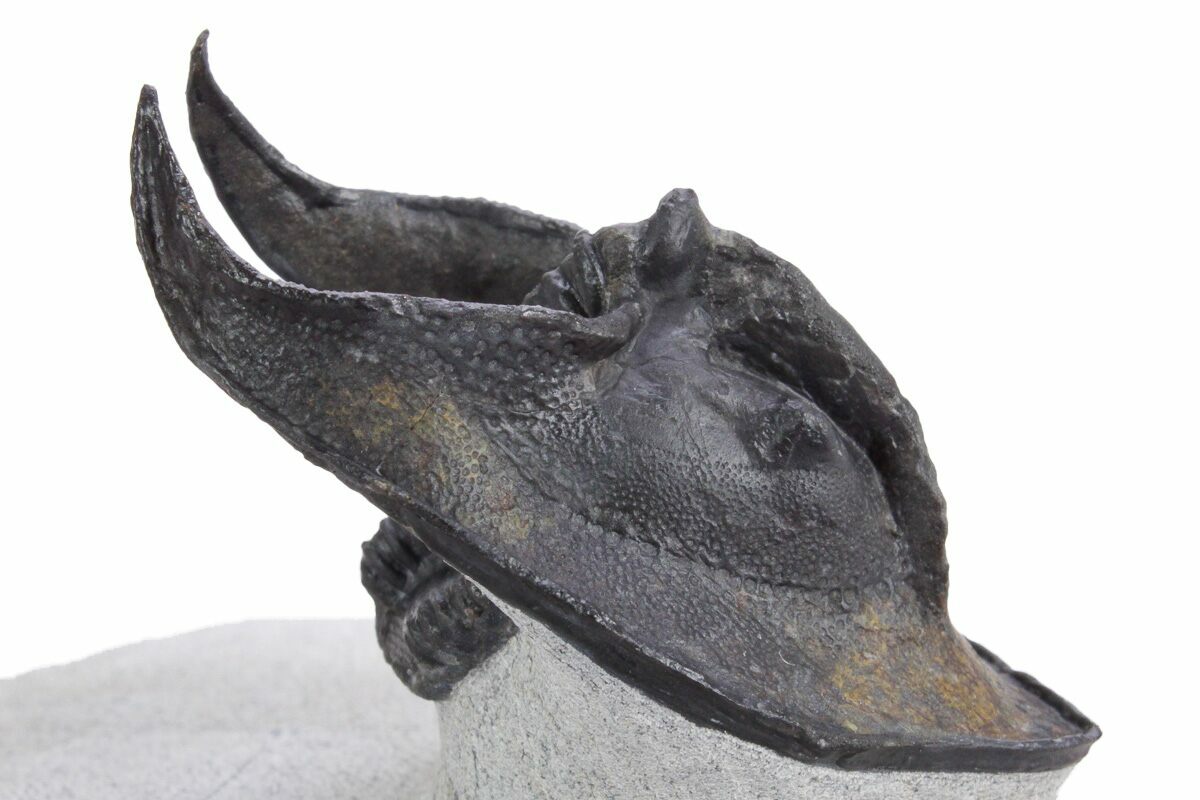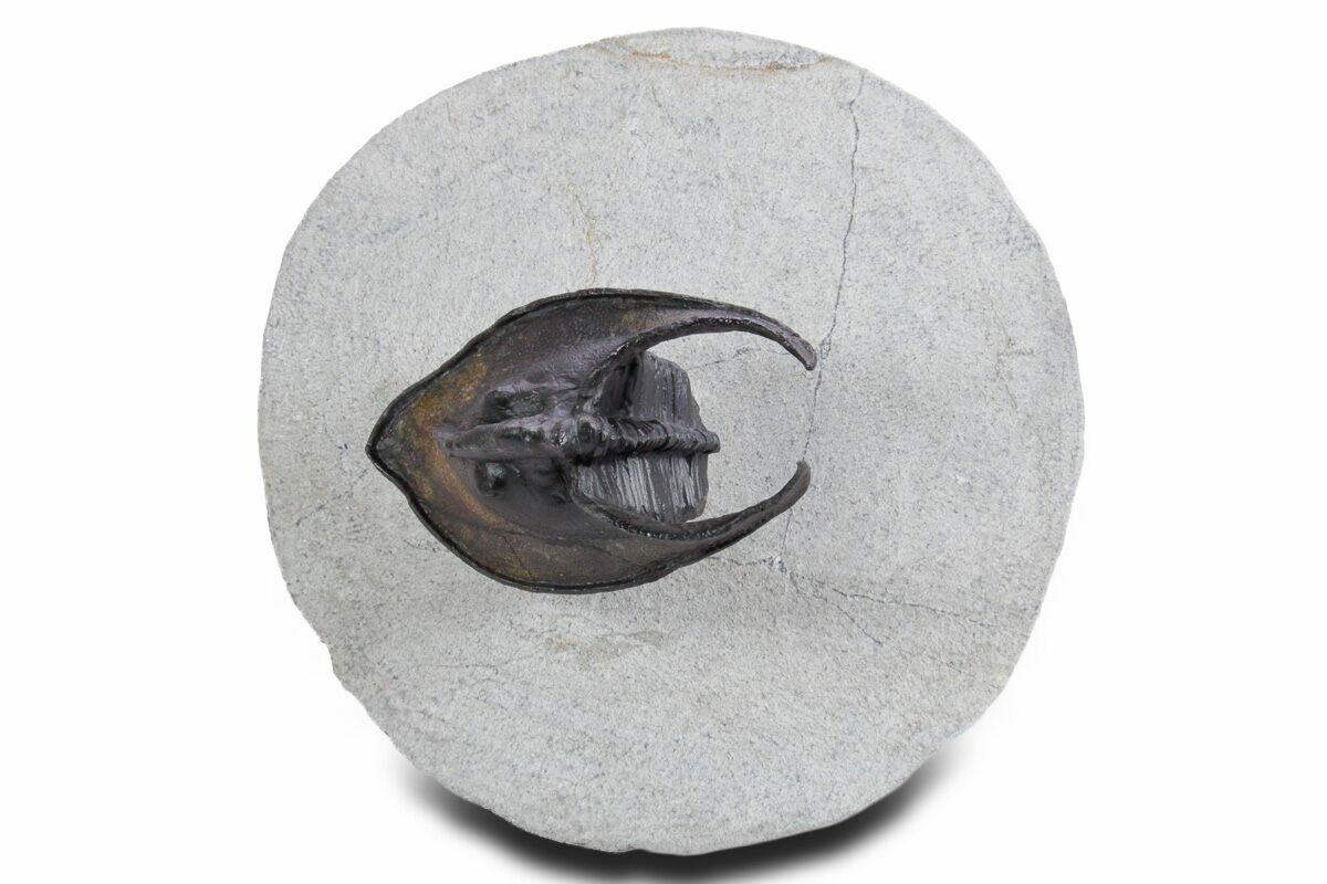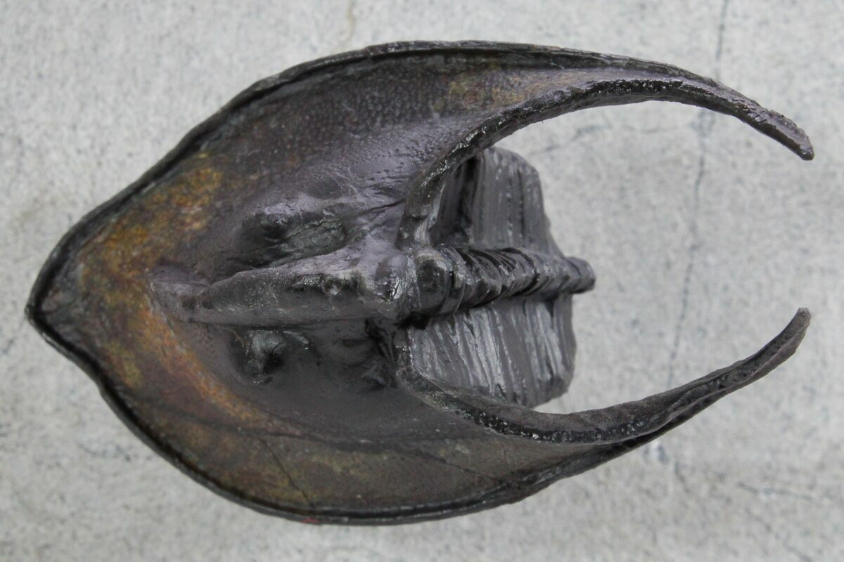 Here is a detailed, 1.75" long, prone example of the Harpetid trilobite Scotoharpes from Morocco. It has some very weird compression resulting in the centerline of the trilobite being laterally compressed. Total shell restoration is about 2-3%