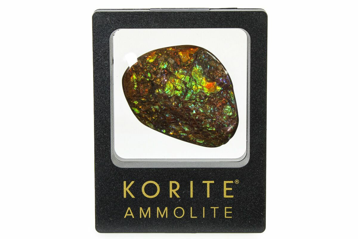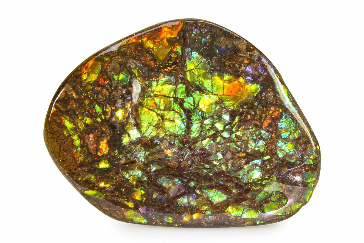 Ammolite is an opal-like gemstone found primarily in Alberta, Canada. It is a kind of fossilized shell from ammonites, which in turn are composed primarily of aragonite, the same mineral contained in nacre (mother-of-pearl). The shell's microstructures are often preserved. In 1981, ammolite was given official gemstone status by the World Jewellery Confederation (CIBJO).