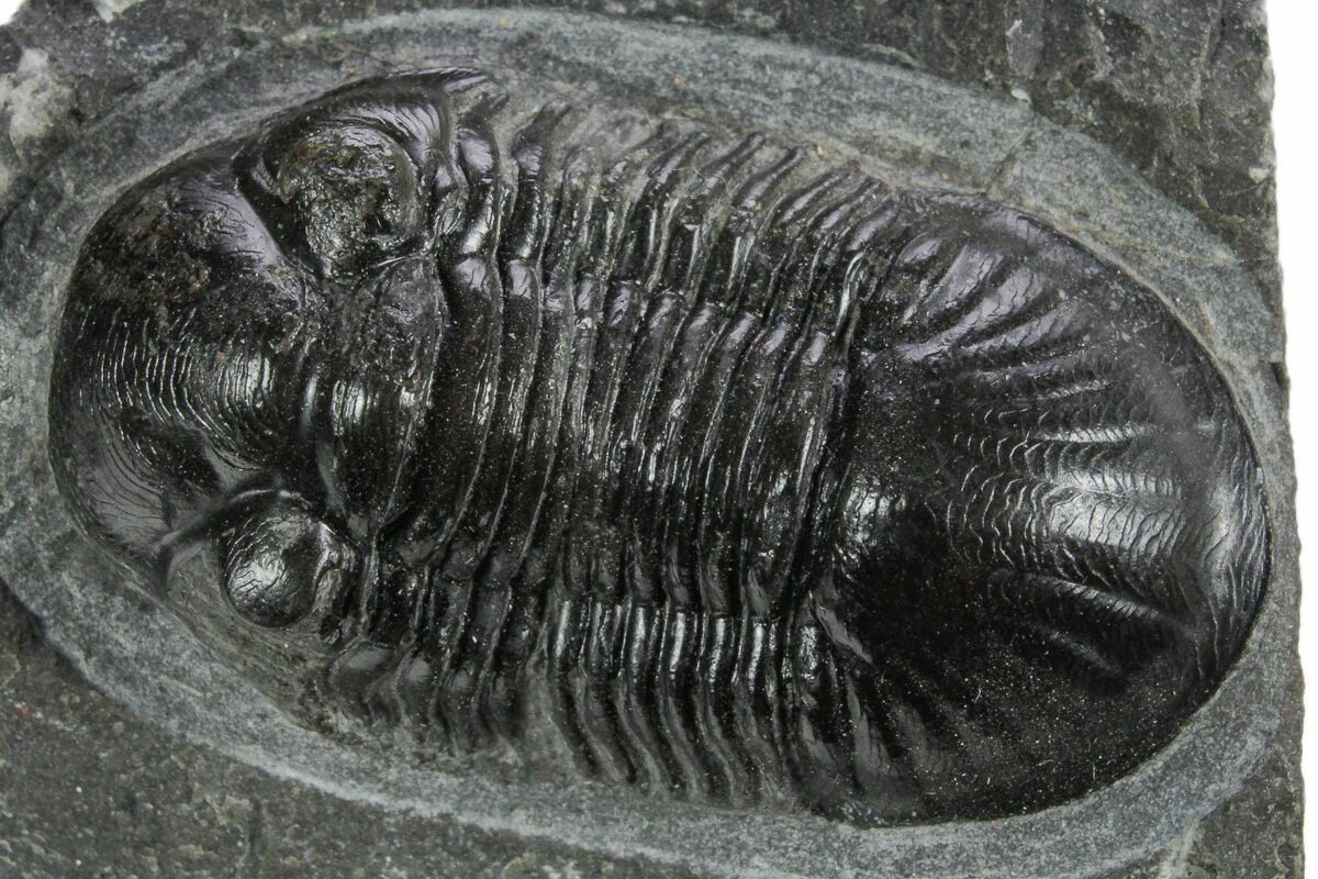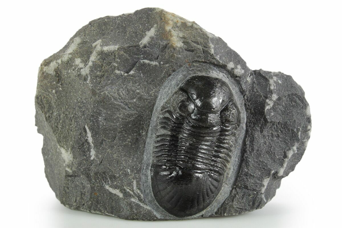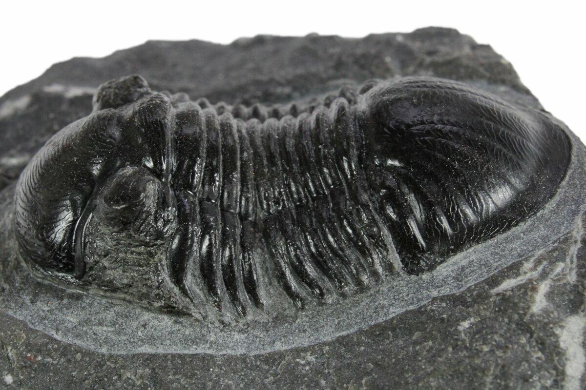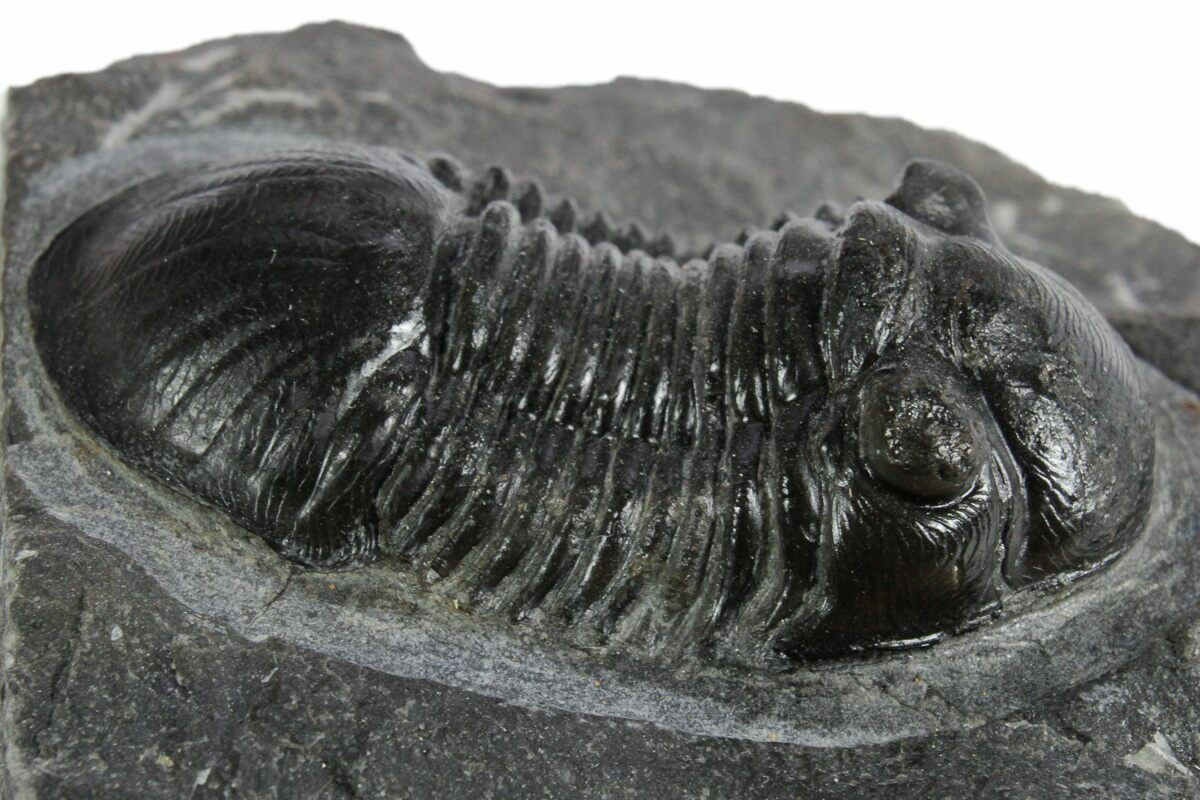 This is a 1.65" long specimen of the Corynexochida trilobite, Paralejurus. It still shows quite a bit of shell detail, and you can even see the hundreds of tiny eye facets under magnification in the right eye. The limestone around it has been removed so that it looks like it is about to crawl off of the rock. The left cheek is missing but it has no restoration.