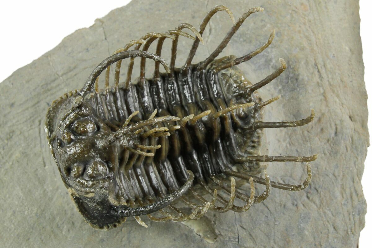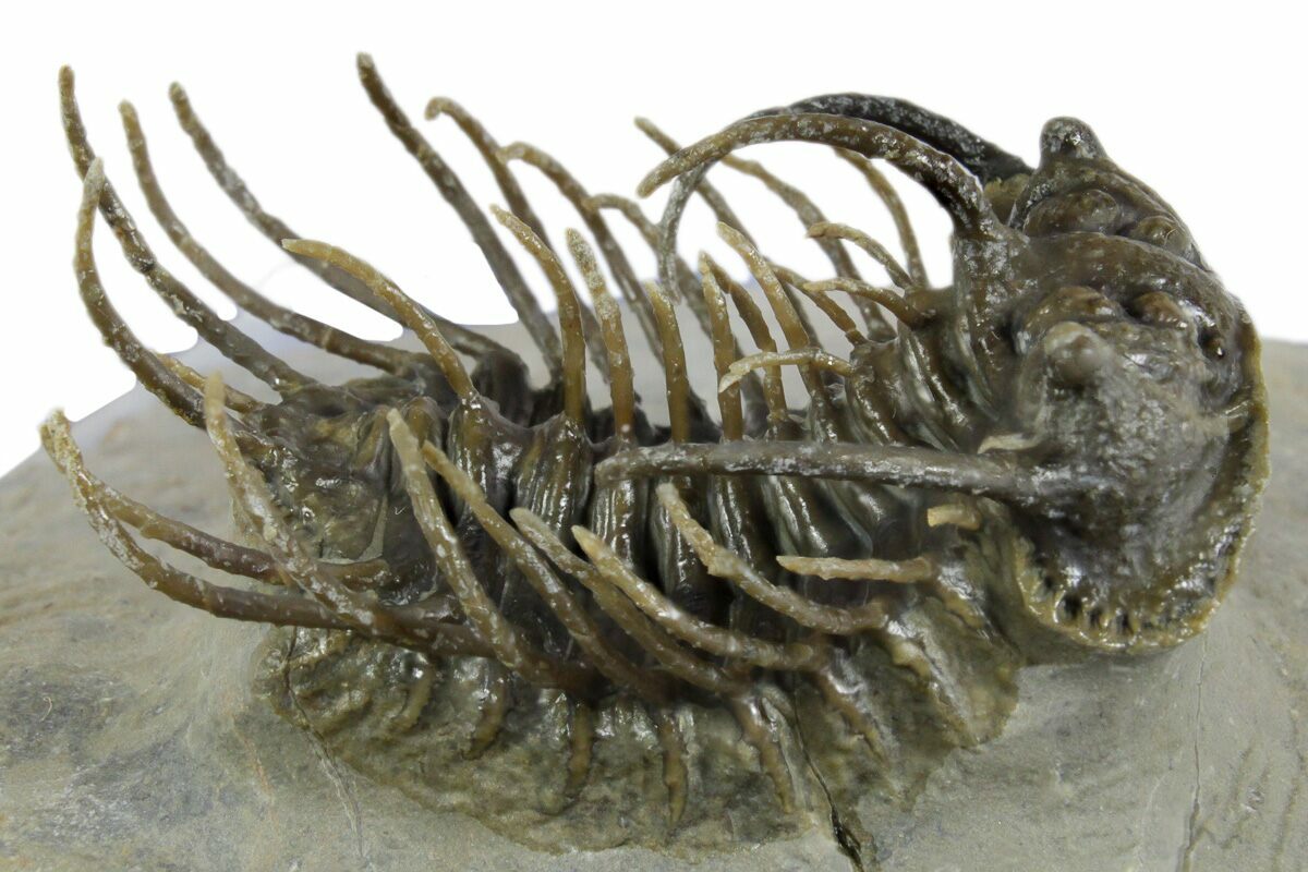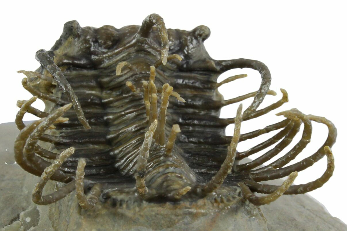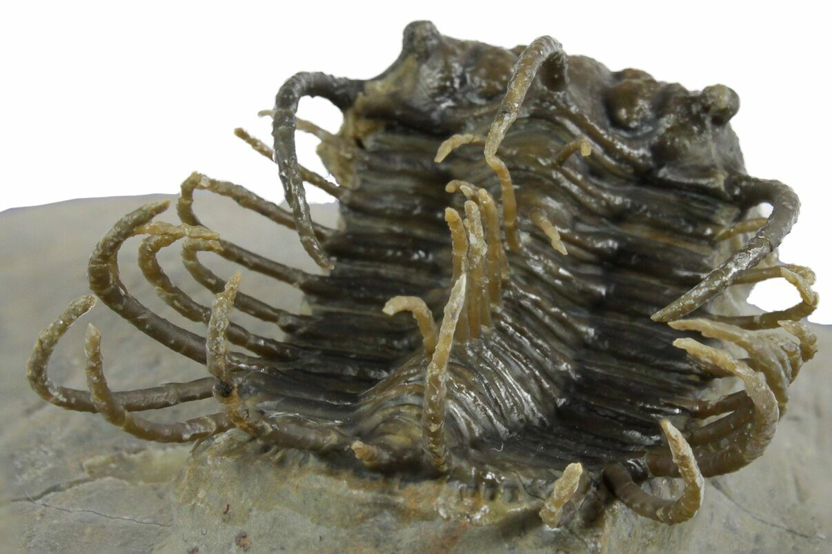 This is an impressive, 1.75" long specimen of a super spiny trilobite (Koneprusia) collected near Ofaten, Morocco. It is a very time consuming process to free all of these long spines from their limestone tomb requiring a tremendous amount of skill. A trilobite like this would have probably taken in the area of 40 hours of work under high magnification using air abrasives.