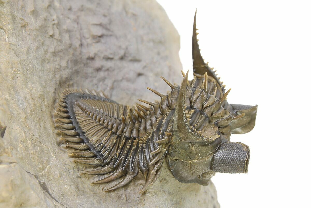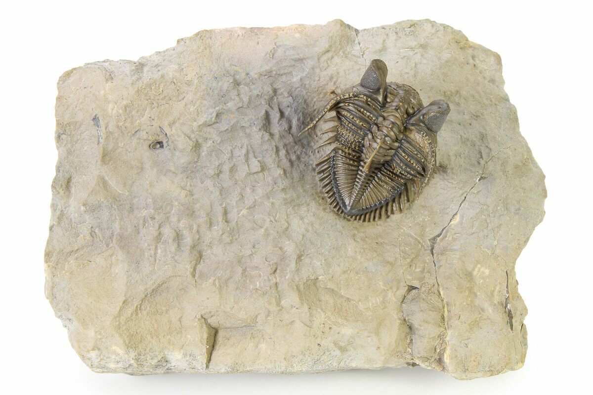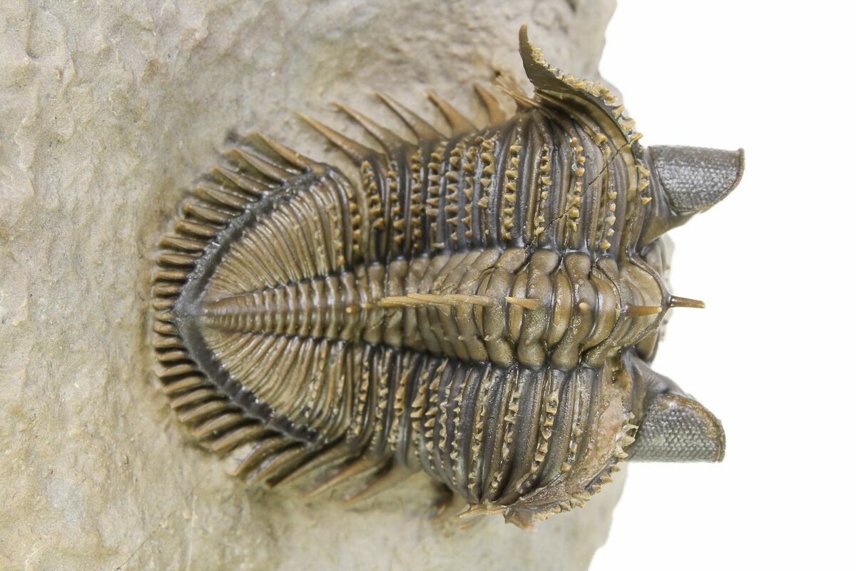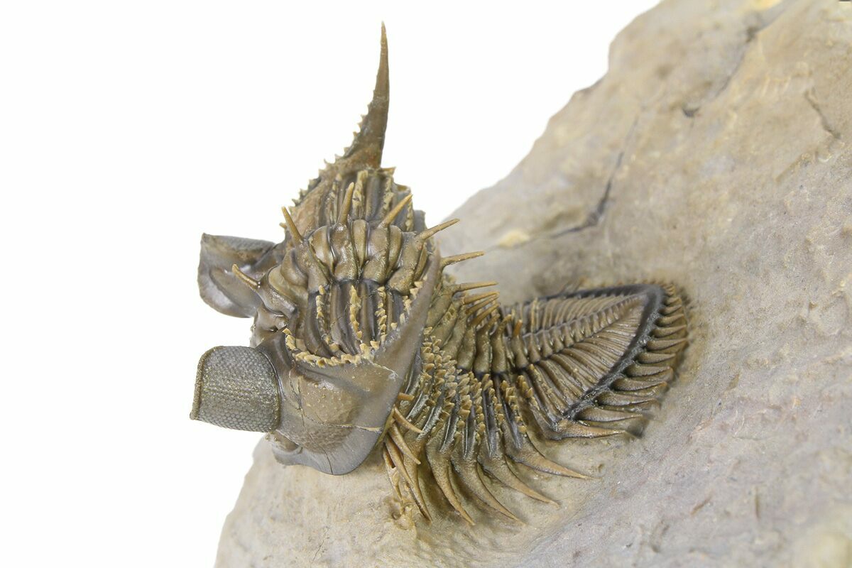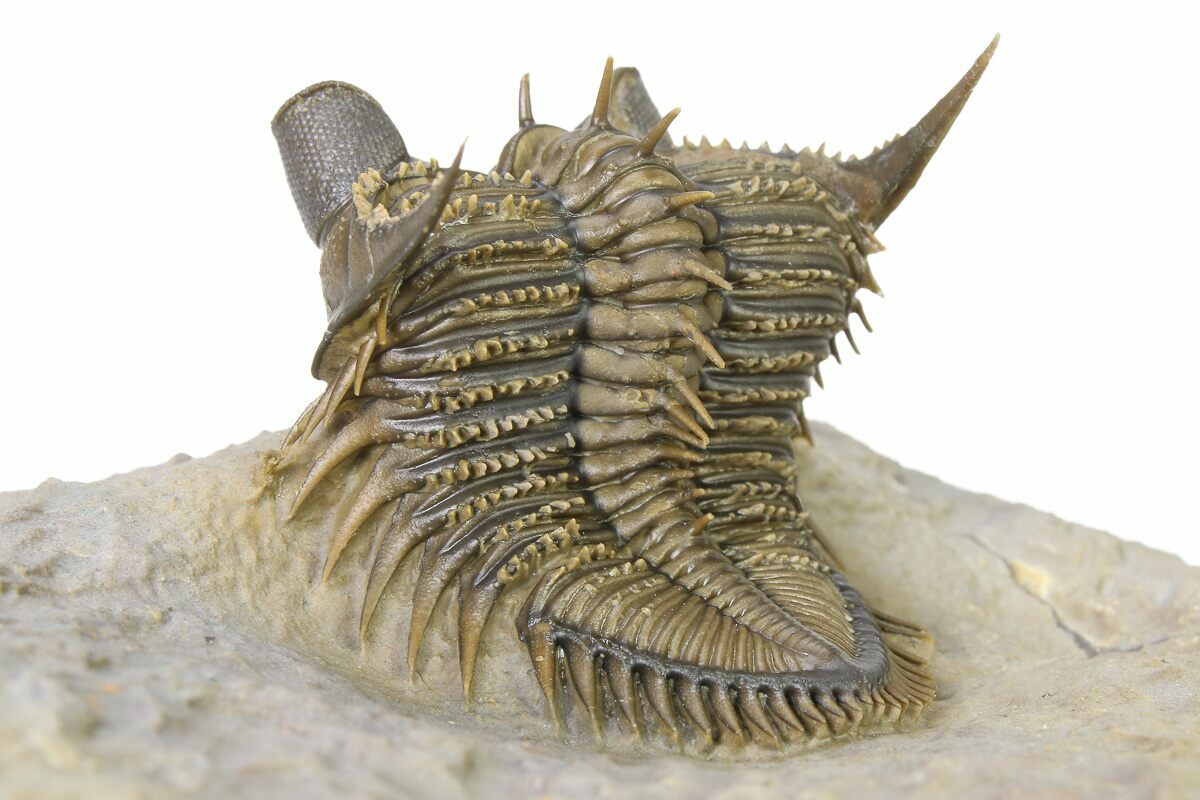 This an amazing, 1.8" long, tower-eye, Erbenochile erbeni trilobite from Foum Zguid, Morocco. Excellent preparation with dozens of free-standing spines and clear eye facets. The preparation on this example is exceptional. It has about 3% shell restoration in total, all on the right side of its head.