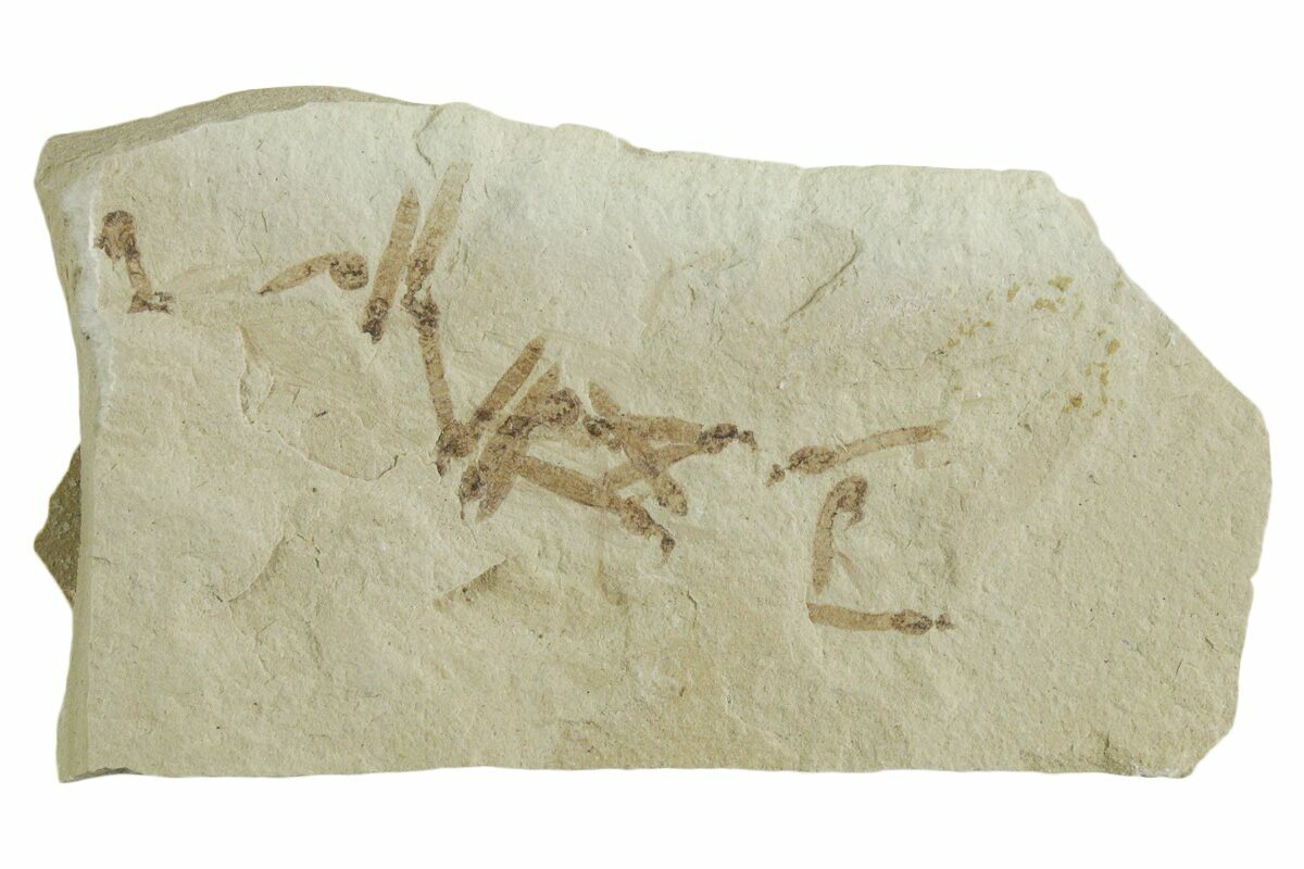 This is a 1.8" wide mortality plate featuring several detailed crane flies (family Tipulidae), collected from the Green River Formation of Utah. While the Green River Formation is best know for its fish fossils, other areas produce incredible plant fossils and insect fauna.