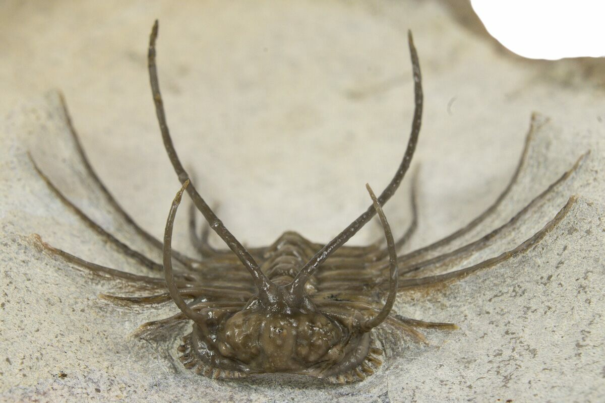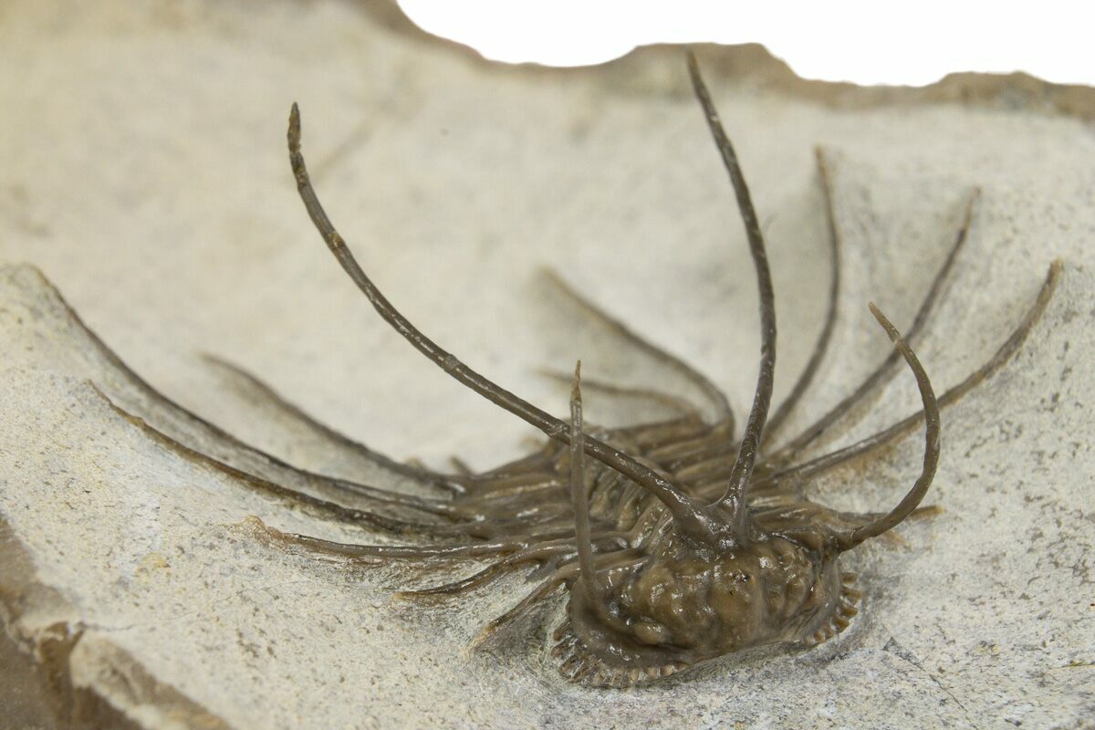Including its long flowing spines it measures 1.5" wide and is 1.4" long. It is laid out prone on a 4.2 x 2.6" section of rock and is superbly prepared. There are several repaired cracks through the segments, however gap fill restoration is minimal at less than 1%.