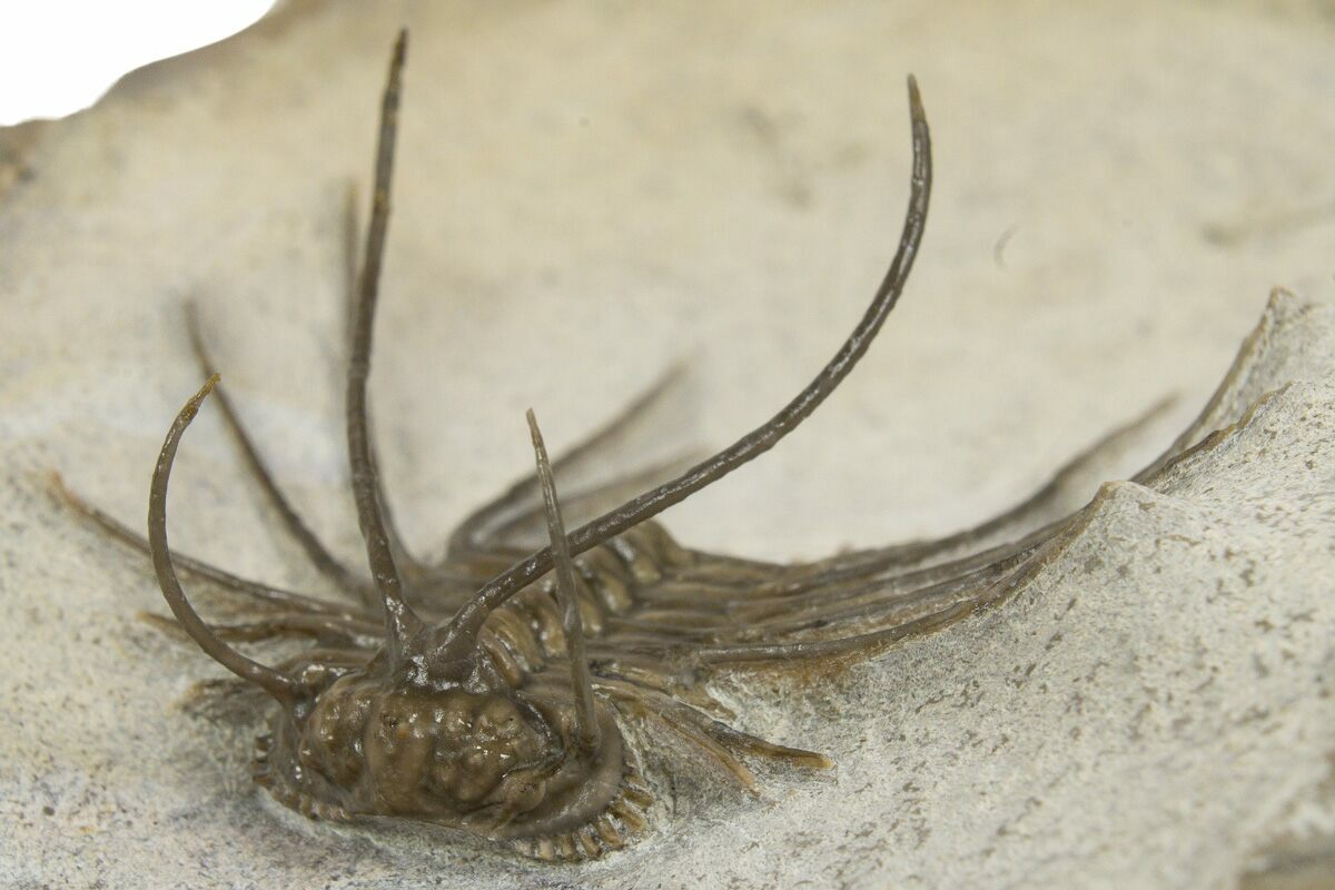 This is a super rare, undescribed Odontopleurid trilobite from Fezna, Morocco (a.k.a. The Jorf White Site). While this trilobites bears many similarities to Ceratonurus, it will likely end up being a new genus when formally described. It is only the third example of this species that I'm aware of. There are a few examples of a similar species known from the "Jorf Red Site" located about 10km away but that species had several key differences, lacking intermediate pleural thoracic spines and fine pygidial spines.