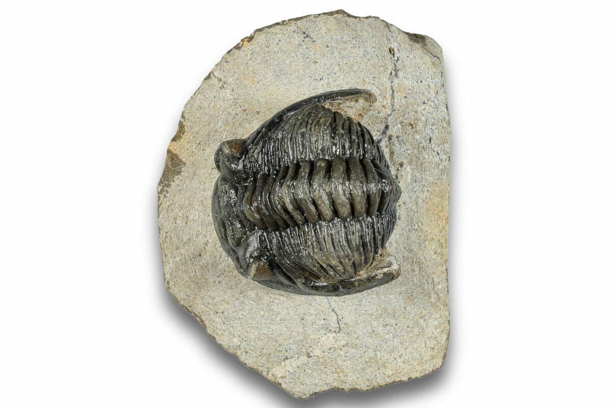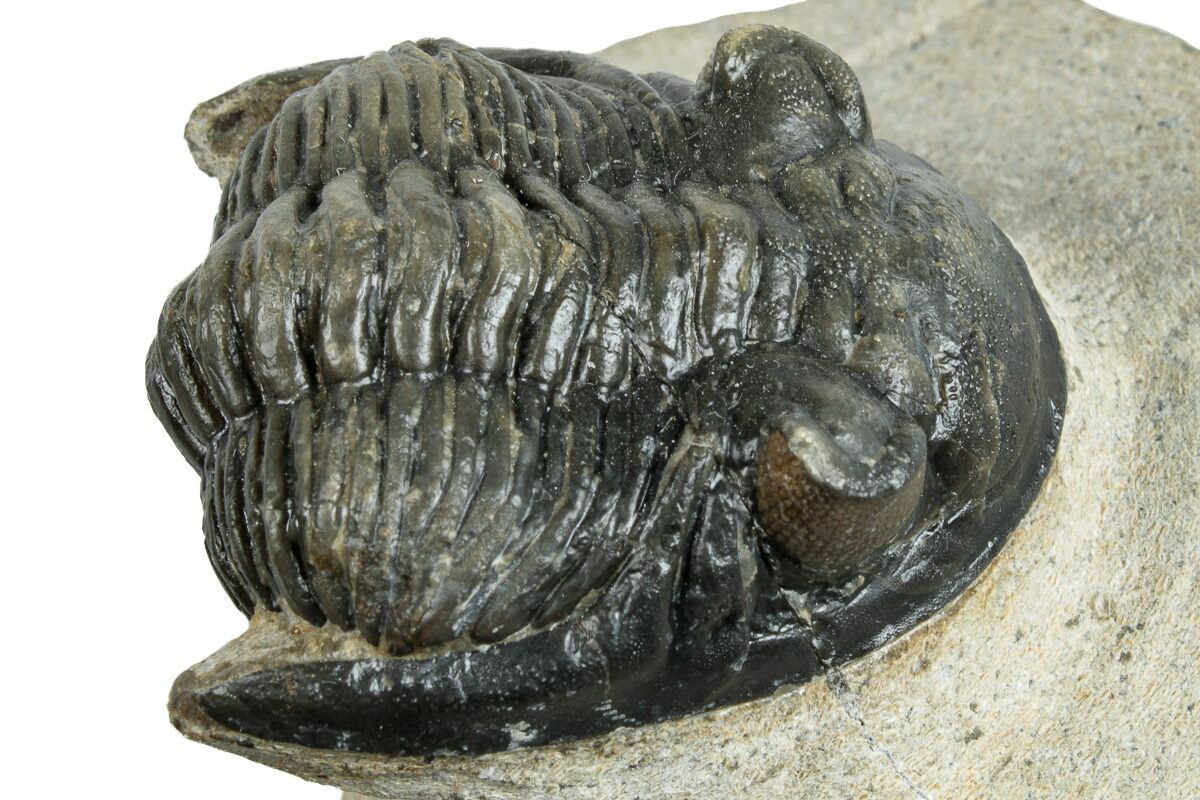 This is a detailed, 1.8" long Hollardops trilobite fossil quarried near Ofaten, Morocco. It has orange eye facet preservation, a features sometimes seen on trilobites from this locality.