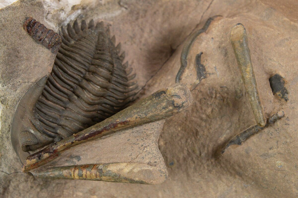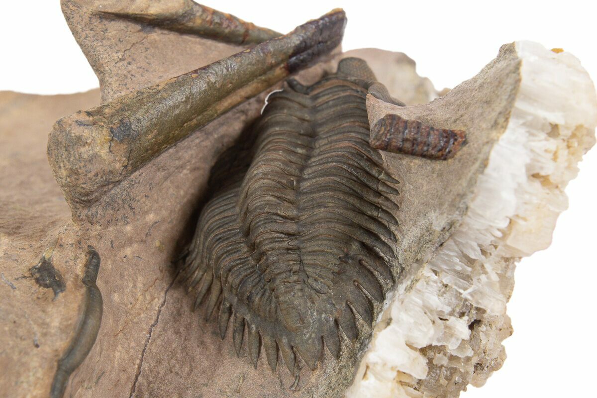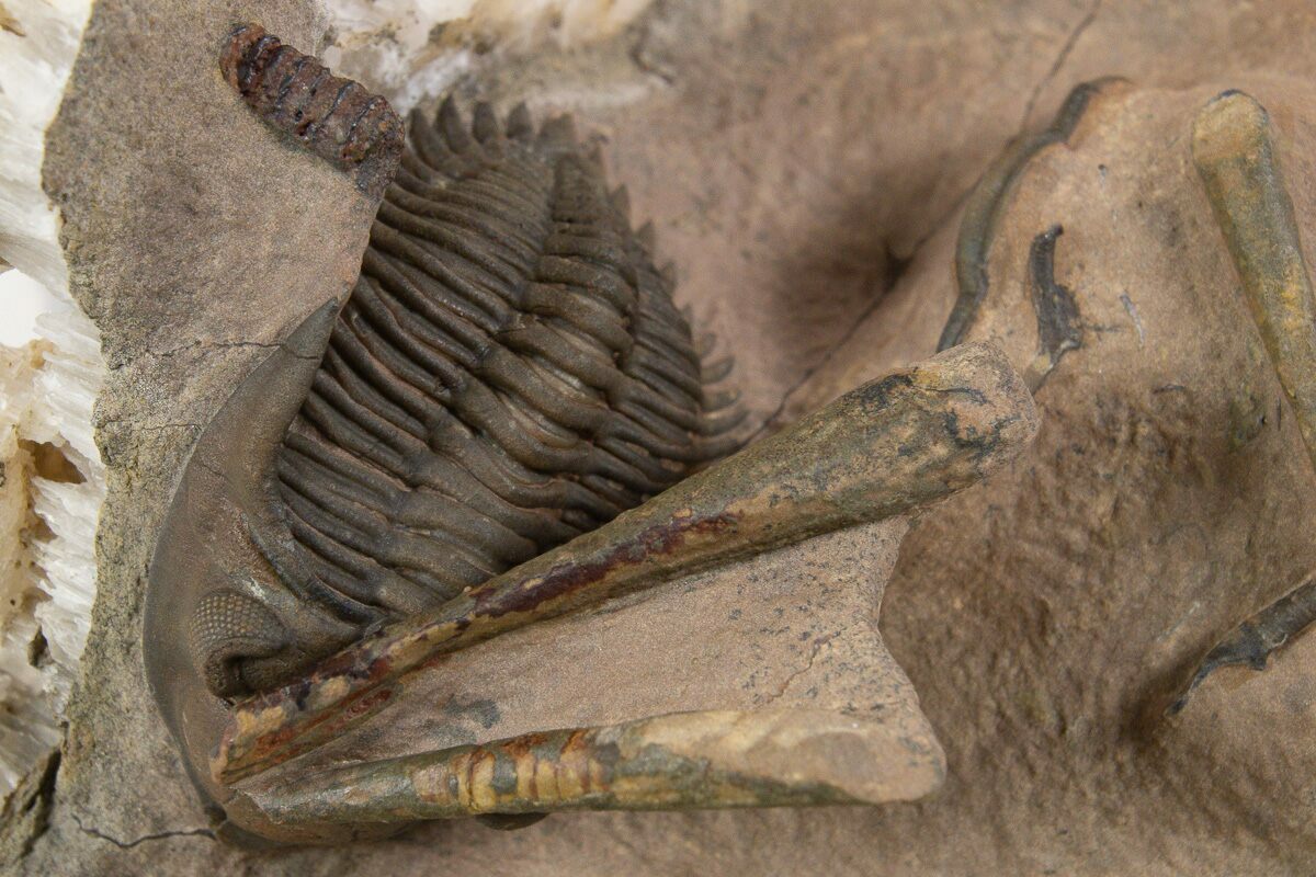 This is a gorgeous, 1.8" long specimen of Metacanthina issoumourensis collected near Lghaft, Morocco. It has a beautiful, chocolate brown shell preservation and the preparation is excellent. There are a number of other fossils present in the limestone including several small cephalopods, trilobite fragments and the head of a Reedops trilobite.