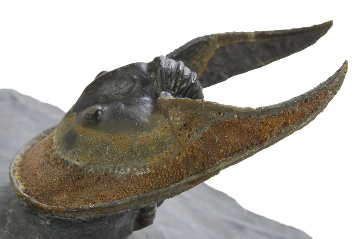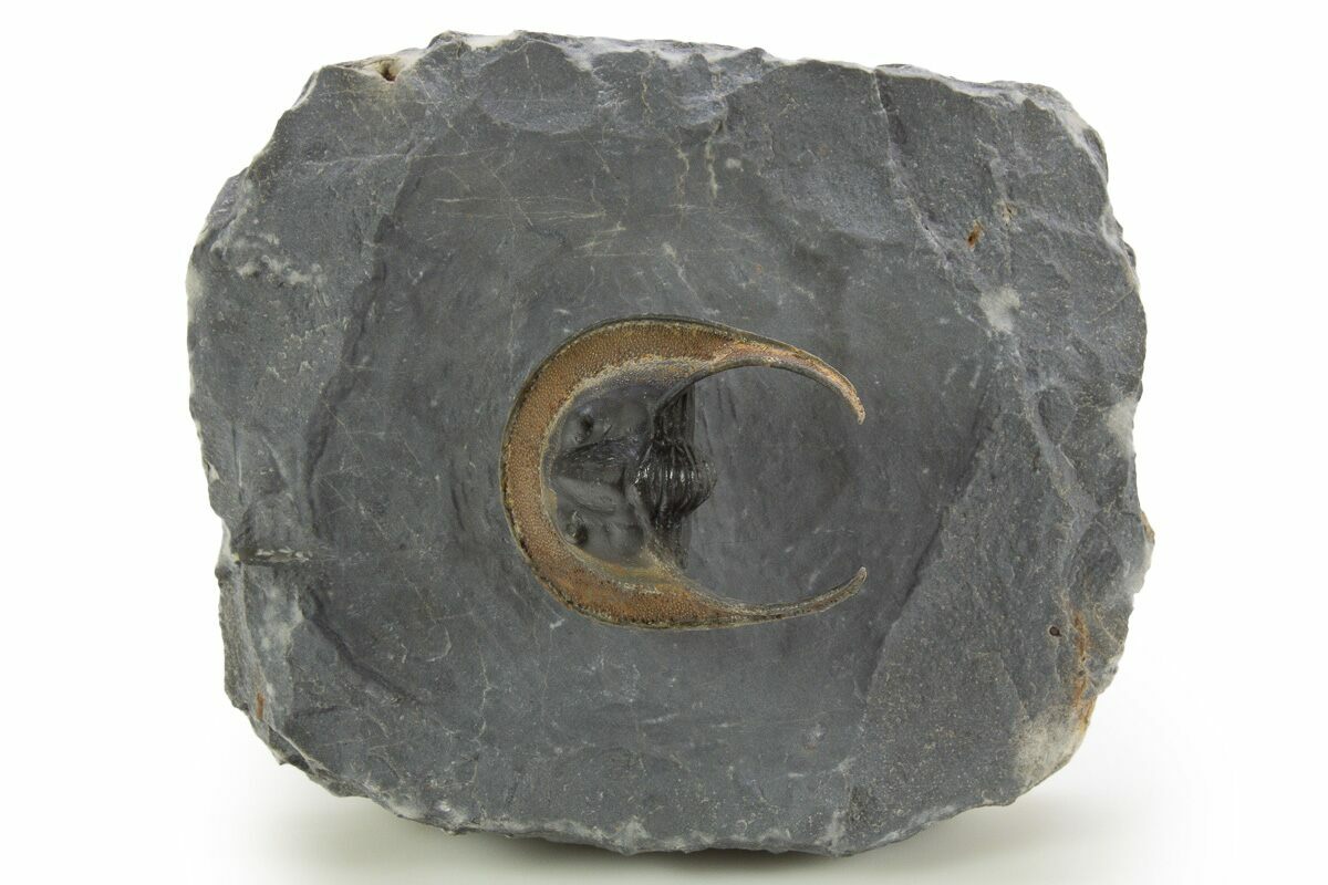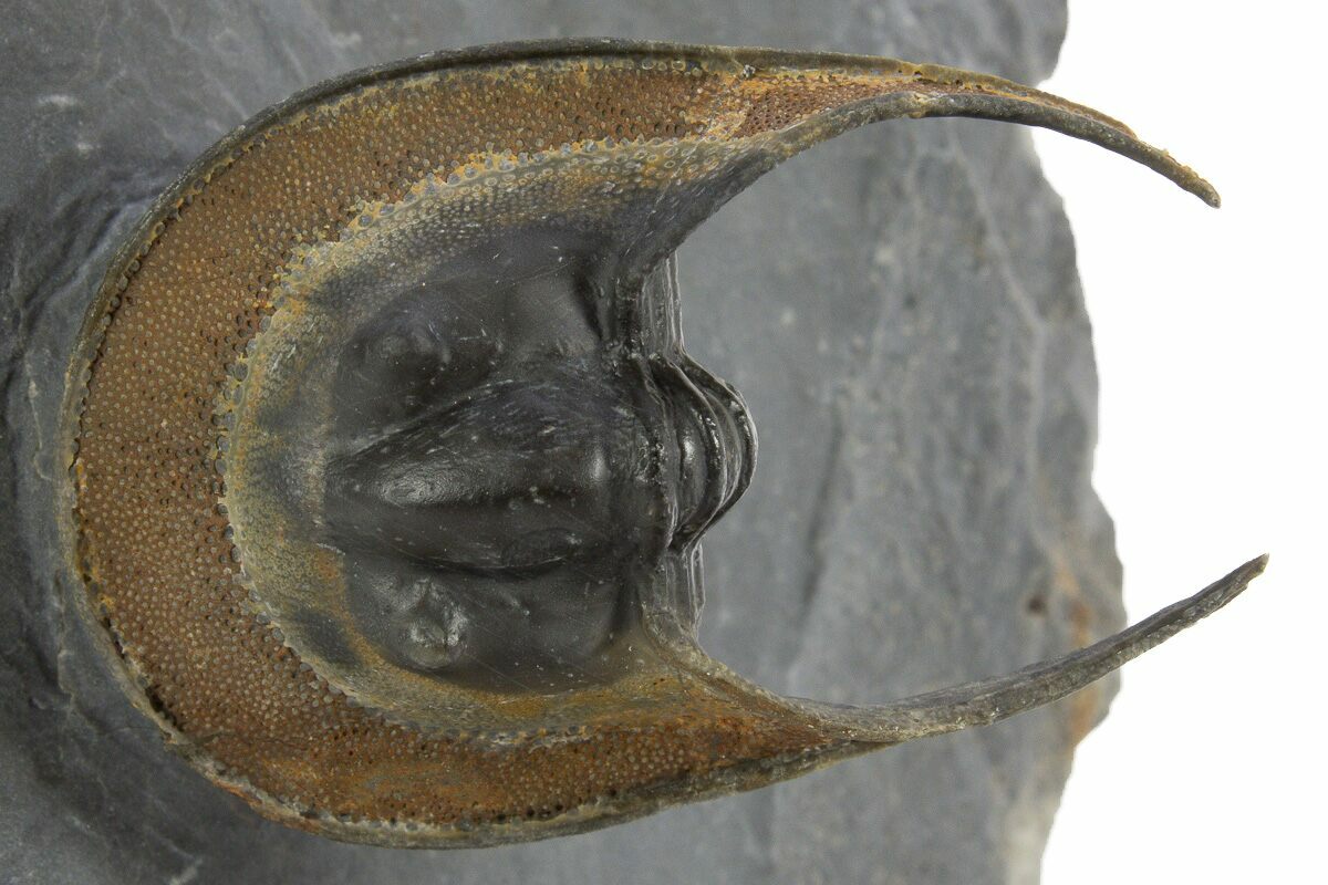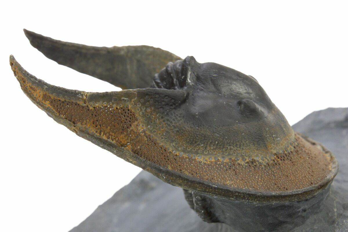 Here is a gorgeous, 1.8" long, enrolled Harpetid (Scotoharpes) trilobite from Morocco. It has a very dramatic "head shield" which is often interpreted as a mechanism to help it stay on top of a soft ocean floor. This preglabellar ring (head shield) is covered in many sensory pits which may have held hairlike features when the trilobite was alive.