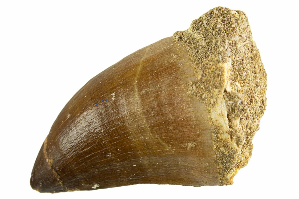 This is a 1.8" fossil mosasaur (Thalassotitan atrox) tooth from the Upper Cretaceous phosphate deposits in the Oulad Abdoun Basin of Morocco.