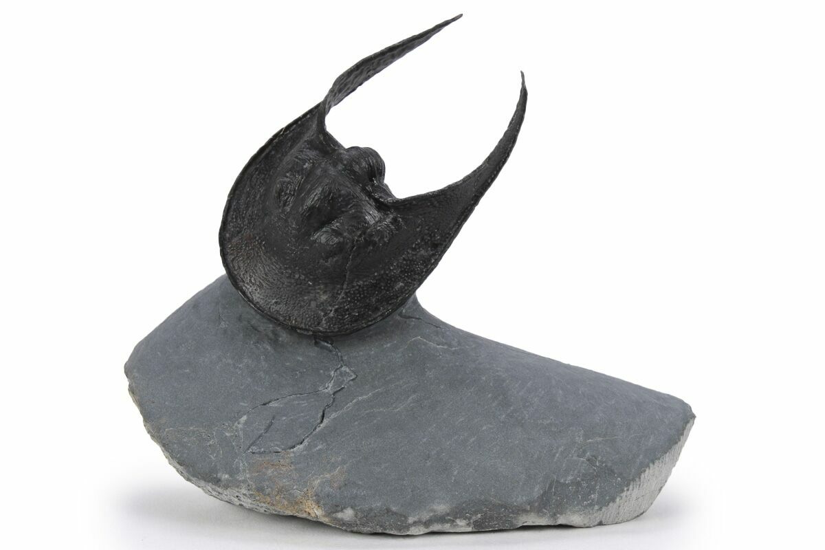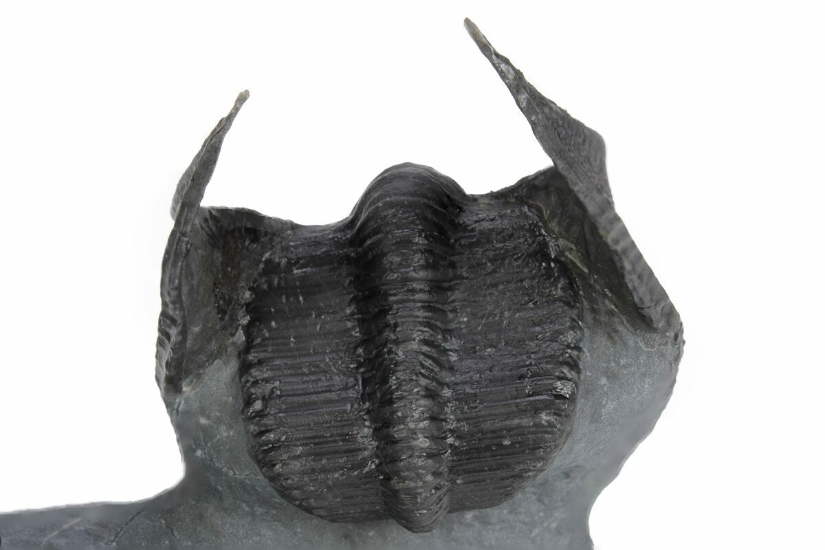 Here is an excellent example of the Harpetida trilobite Scotoharpes sp. from Morocco. It has a very dramatic "head shield" which is often interpreted as a mechanism to help it stay on top of a soft ocean floor. This preglabellar ring (head shield) is covered in many sensory pits which may have held hairlike features when the trilobite was alive.
