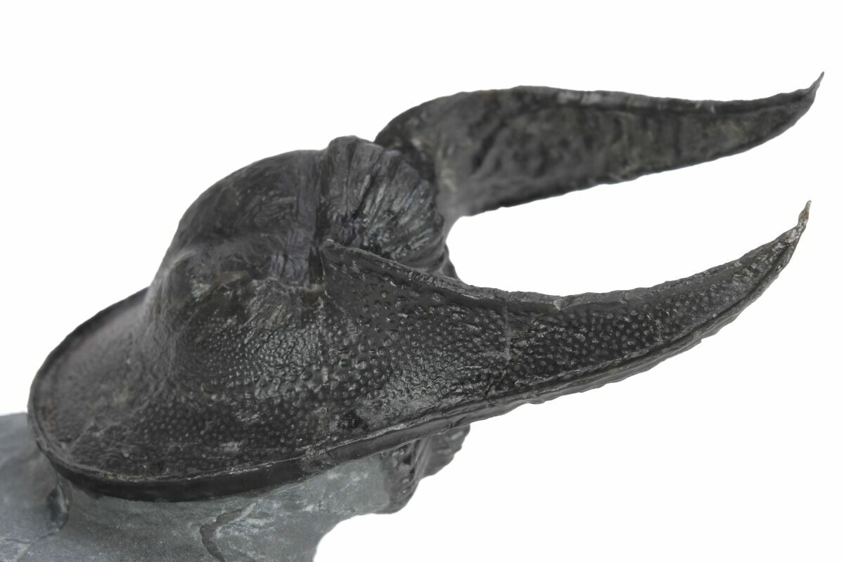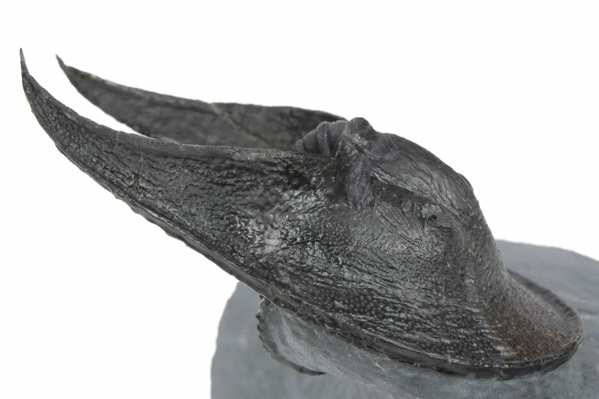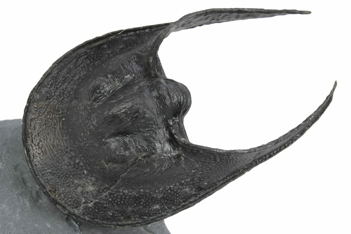 This specimen is partially enrolled with the genal spines prepared free-standing. The specimen has no restoration.