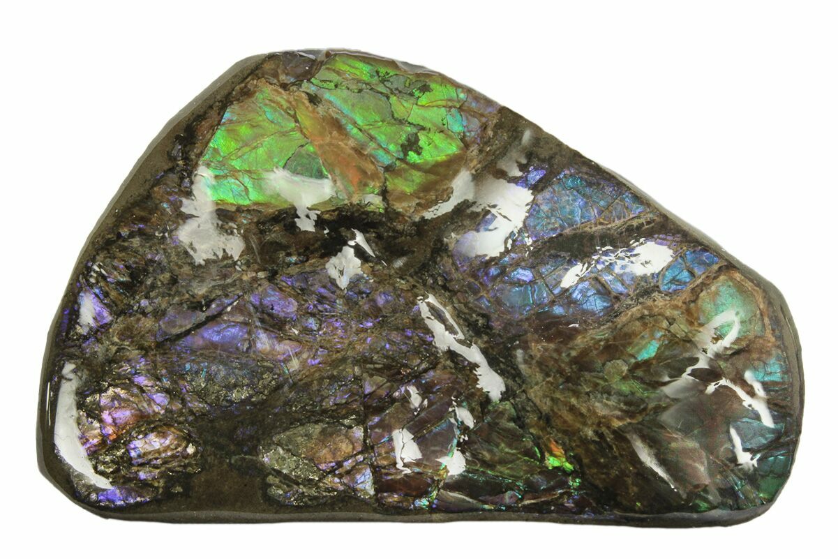 This is a 1.8" wide section of brilliant, iridescent ammolite from the Bear Paw Shale of Alberta, Canada. It has wonderful purple, blue, and green hues that shimmer differently depending on what angle the specimen is viewed from.