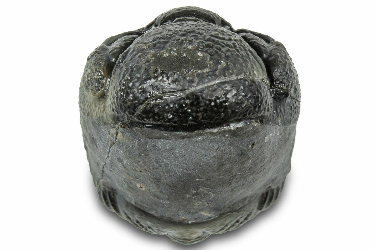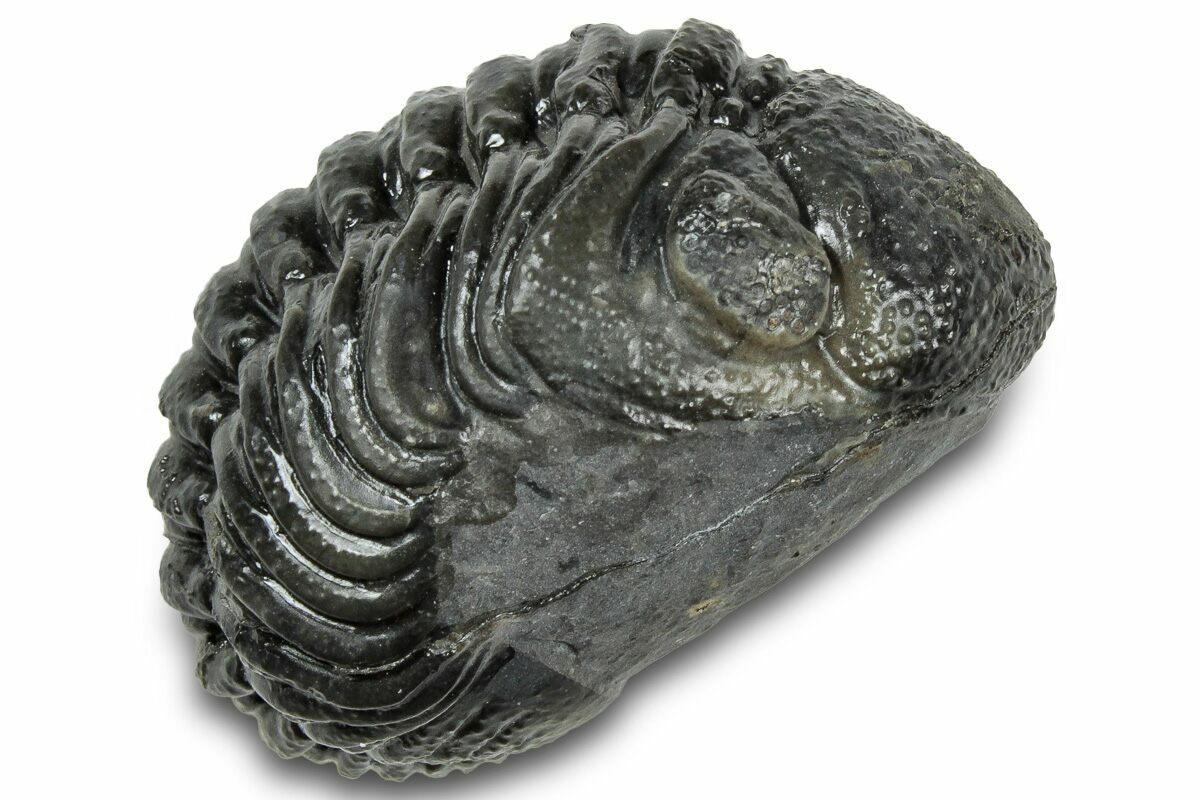 This is a curled, 1.8" long Austerops trilobite from Ofaten, Morocco. It has nice shell preservation and visible eye facets.