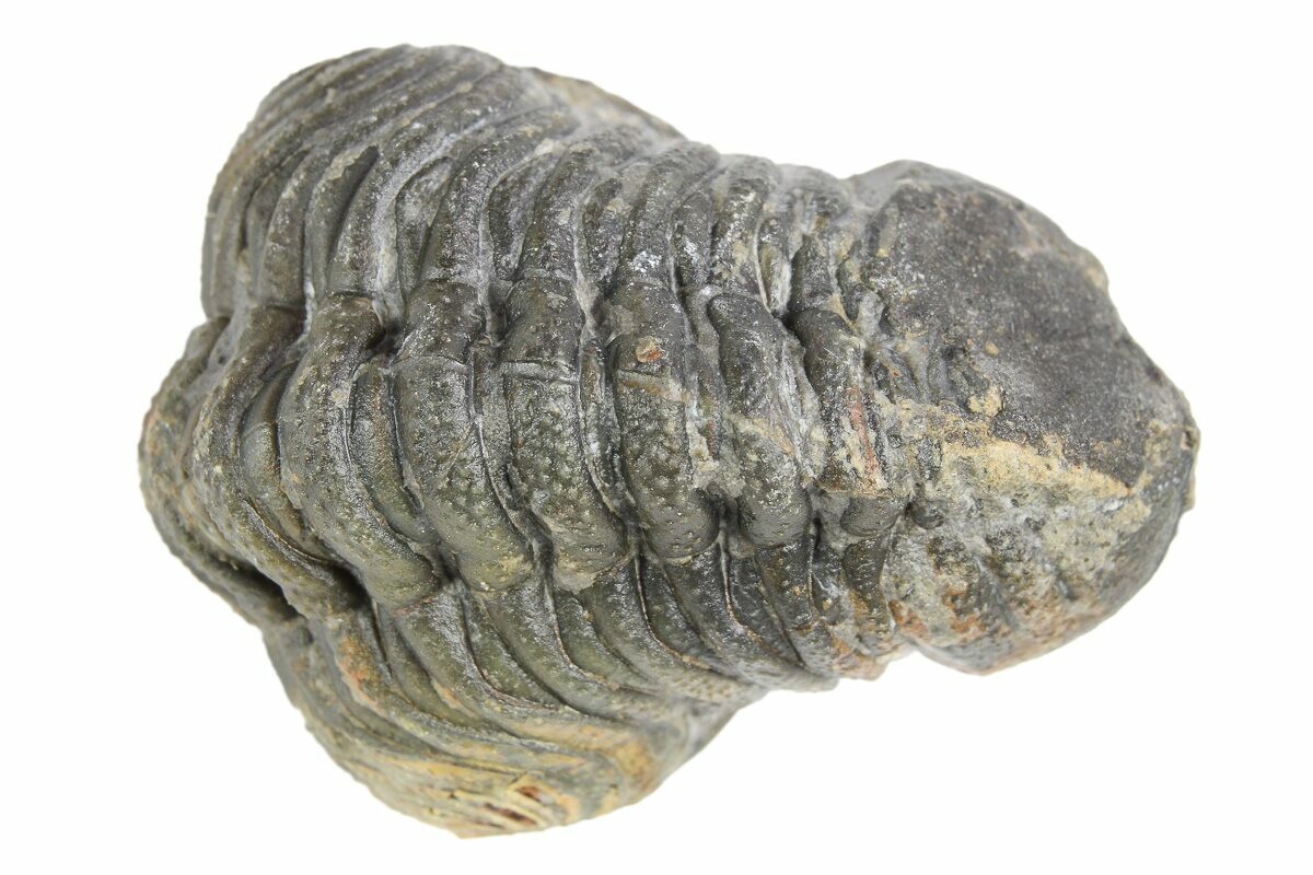 This is a curled, 1.8" long (if outstretched) Morocops trilobite from Morocco. The right side its tail has been restored.