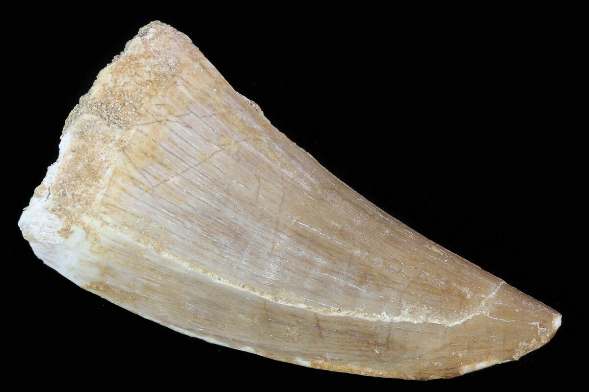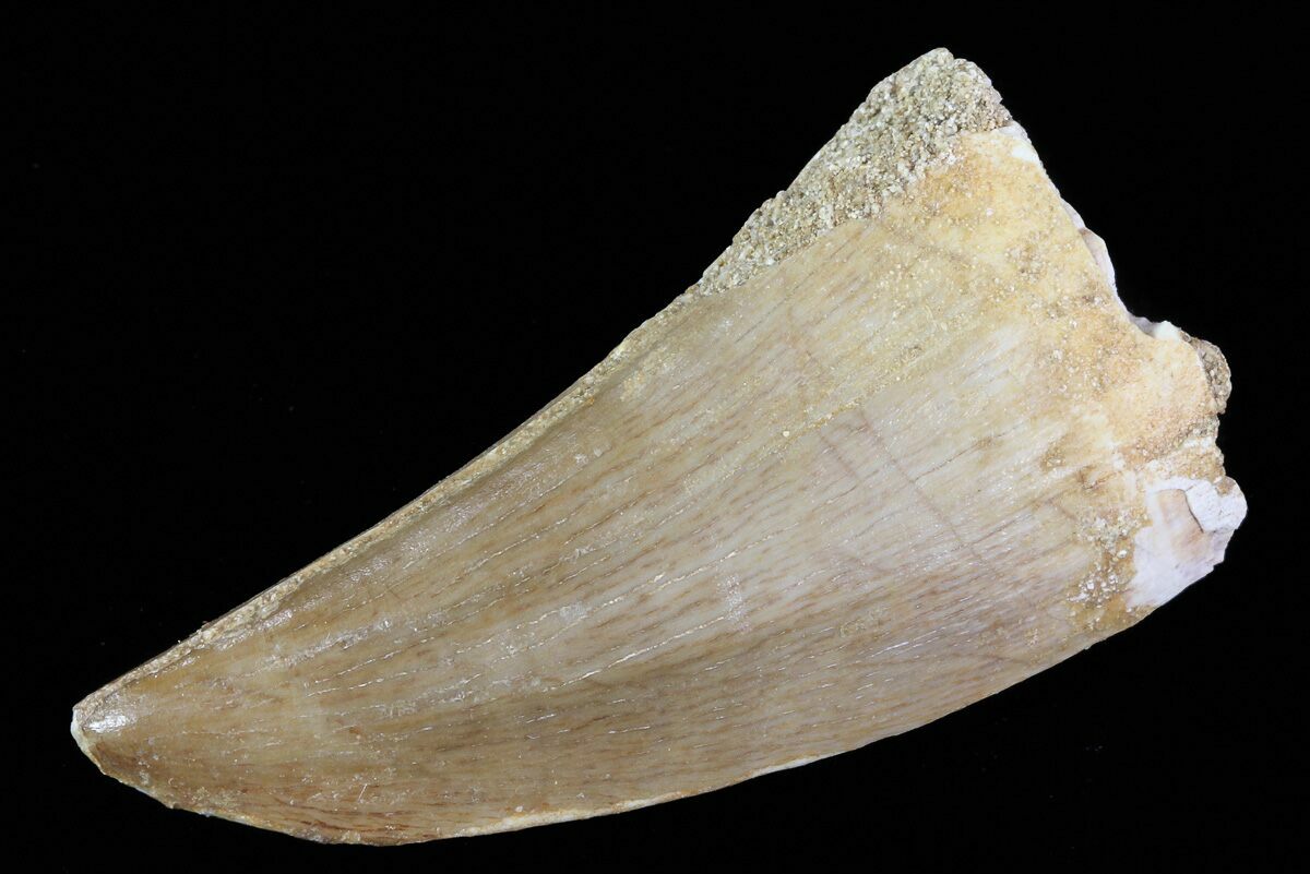This is a fossil tooth of the Mosasaurus beaugei from the Upper Cretaceous phosphate deposits in the Oulad Abdoun Basin of Morocco. There is one repaired crack near the tip of the tooth. True Mosasaurus teeth are much more rare in these deposits than teeth of the toher types of mosasaurs like Prognathodon.