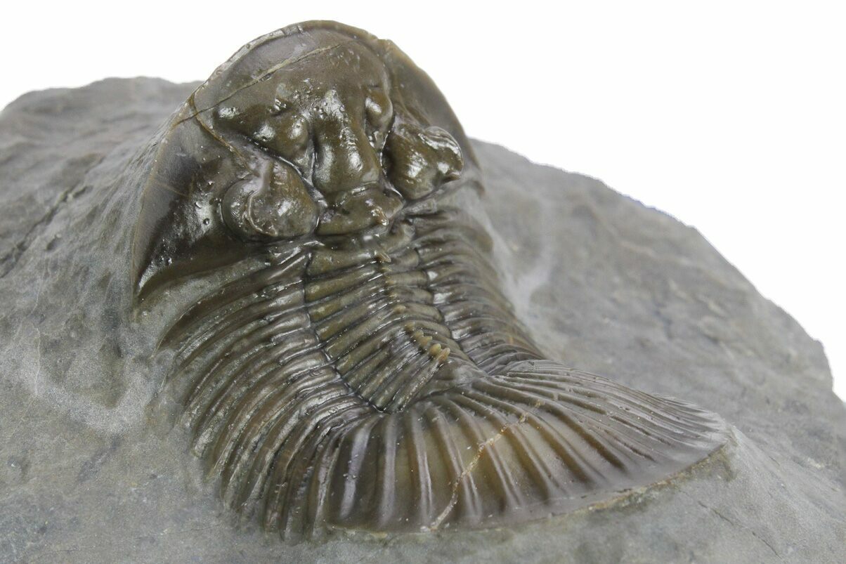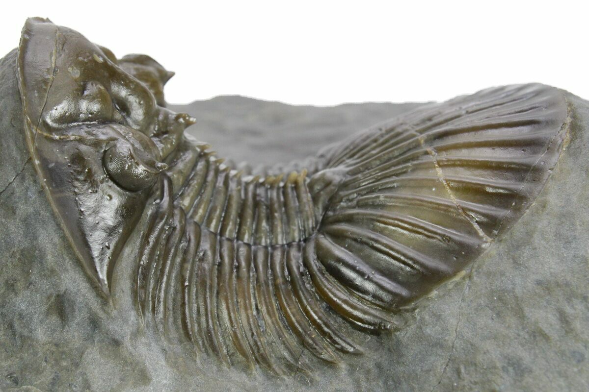 This is a beautiful, 1.8" long, Scabriscutellum trilobite from Ofaten, Morocco. Excellent shell detail including thousands of tiny eye facets are present. It has a natural, multi-toned shell coloration and nice preparation.