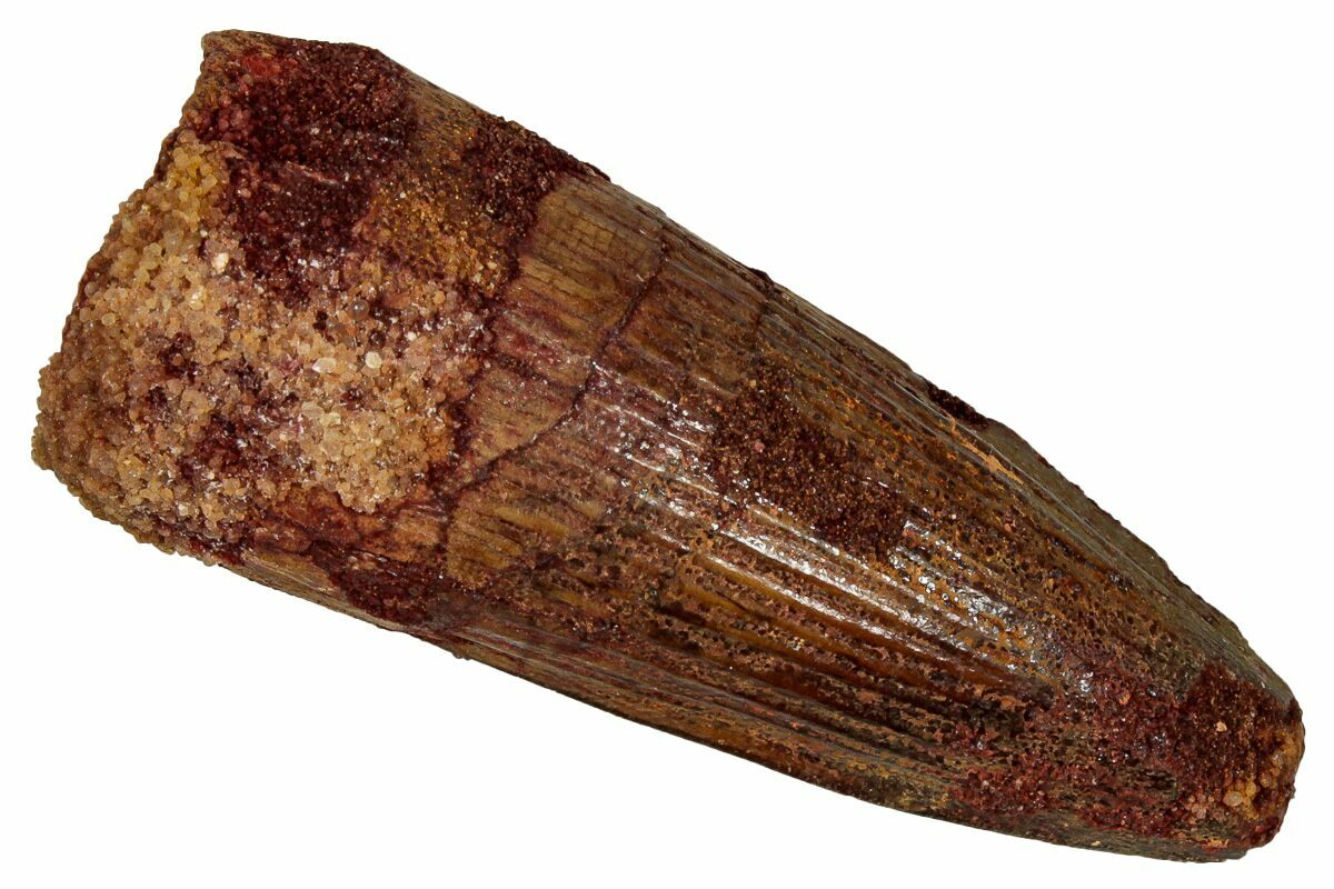 Spinosaurus teeth are relatively common fossils, but large (3+ inches), well-preserved examples are rare. These large Spinosaurus teeth will often be heavily doctored. We’ve seen many examples where multiple partial teeth can been glued to together to create a larger fake tooth, or where enamel has been painted on. One giveaway to look for is a ring of sand around the middle of the tooth, usually glued on to hide a break. Sometimes this is a sign that multiple partial teeth have been composited, but other times it is used to disguise a badly done repair job.