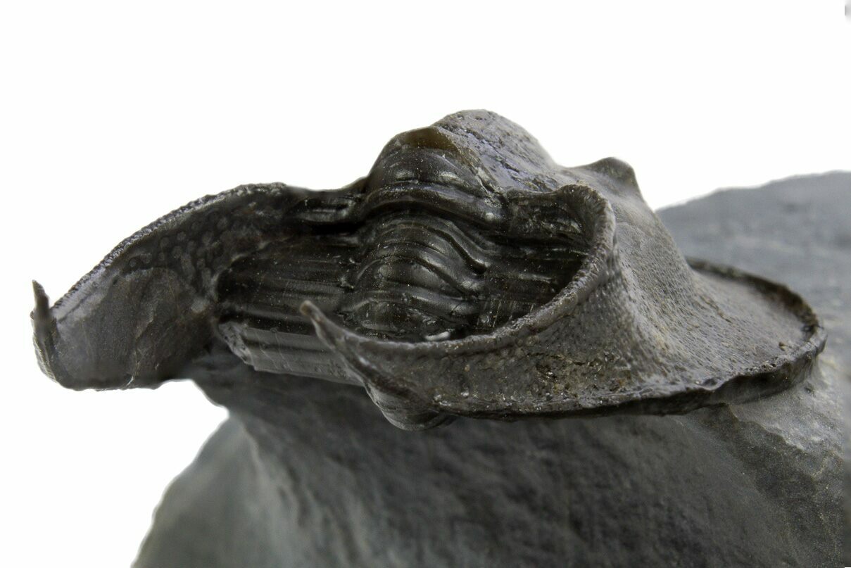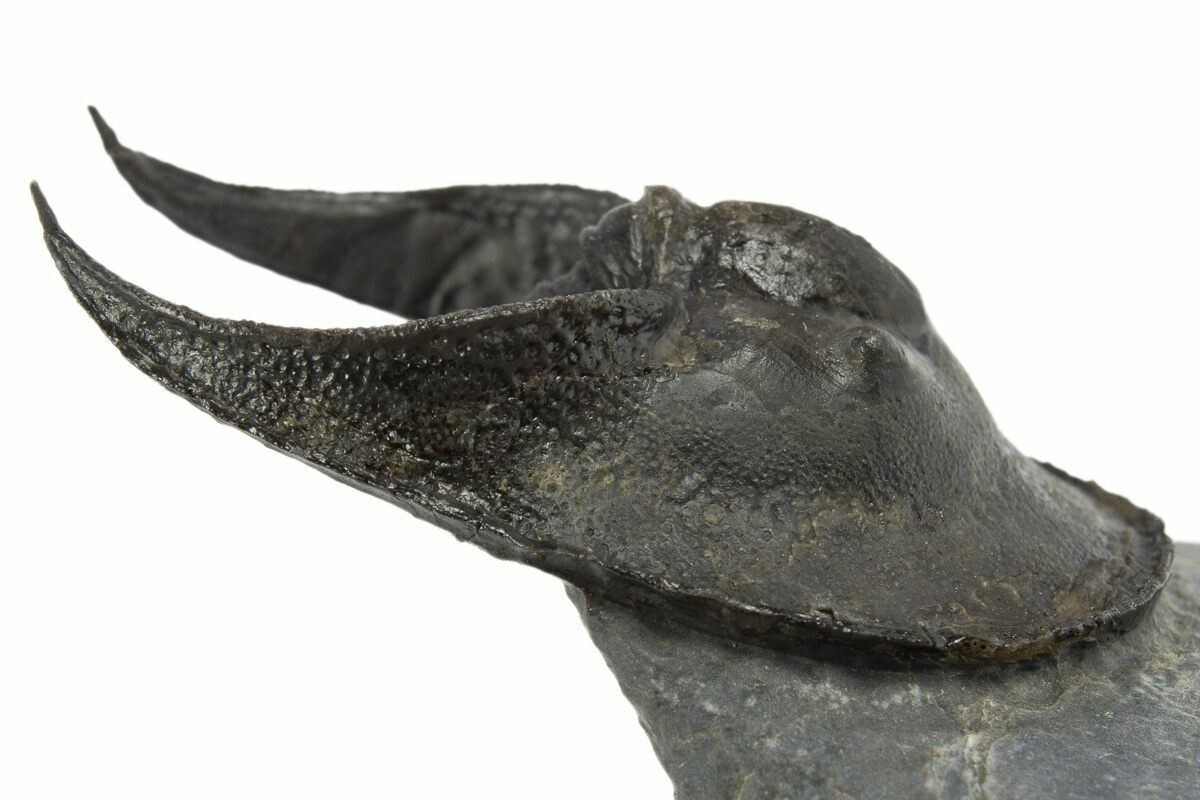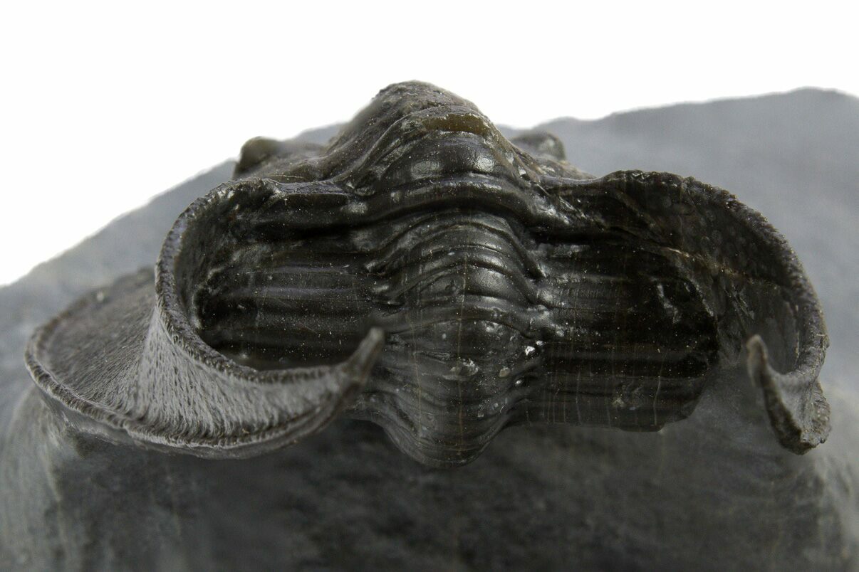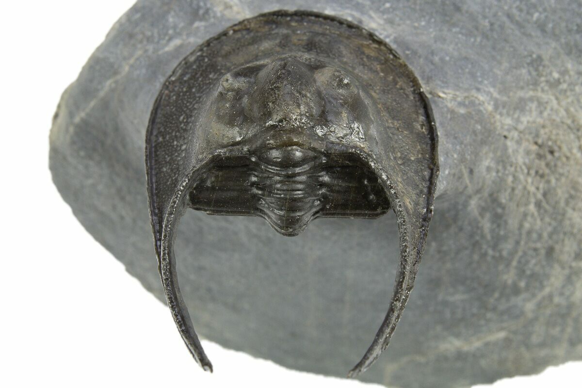 Here is a gorgeous, 1.85" long, enrolled Harpetid (Scotoharpes) trilobite from Morocco. It has a very dramatic "head shield" which is often interpreted as a mechanism to help it stay on top of a soft ocean floor. This preglabellar ring (head shield) is covered in many sensory pits which may have held hairlike features when the trilobite was alive.