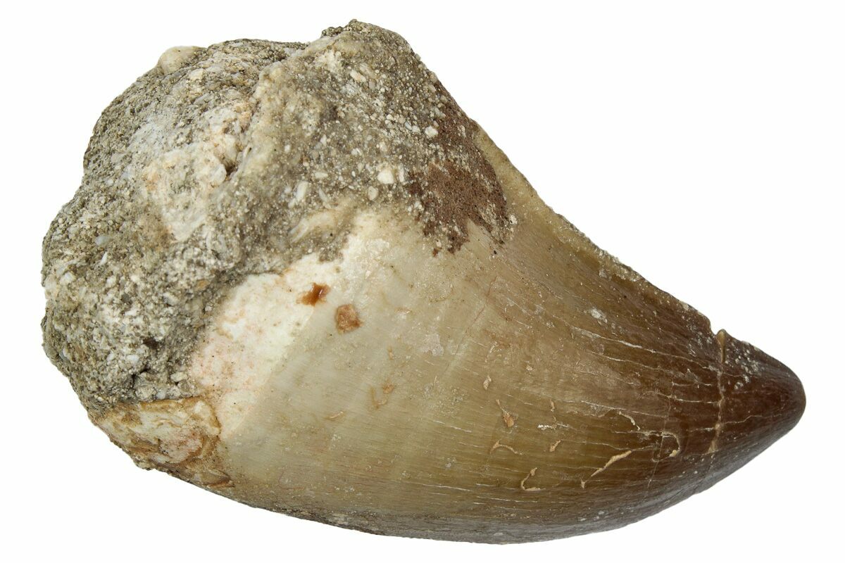 This is a 1.85" fossil prognathodontid mosasaur tooth from the Upper Cretaceous phosphate deposits in the Oulad Abdoun Basin of Morocco.